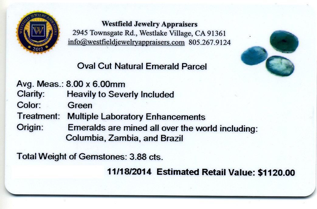 3.88cts. Oval Cut Natural Emerald Parcel Westfield Appraised at $1,120.00.
