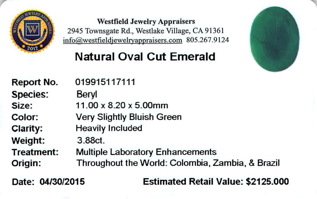 One oval cut natural emerald, measuring 11.00 x 8.20 x 5.00mm, exact weight 3.88ct., clarity is heavily included, type III, medium dark, very slightly grayish, very slightly bluish green color, (GIA vslbG 6/3), cut is good. Westfield Appraised at $2,125.00.