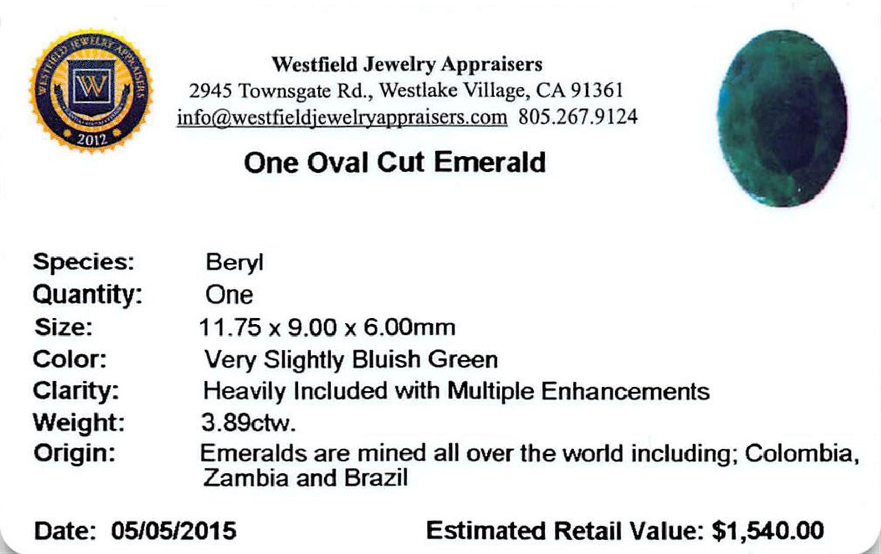 One oval mixed cut natural emerald, measuring 11.75 x 9.00 x 6.00mm, exact weight 3.89ct., clarity is heavily included, type III, medium dark, very slightly grayish, very slightly bluish green color, (GIA vslbG 6/3) Indications of multiple laboratory enhancements, including high temperature heat treatment. Westfield Appraised at $1,540.00.