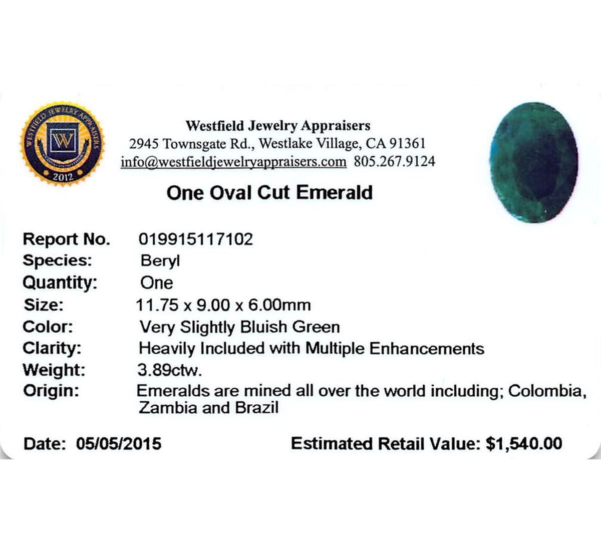 One oval mixed cut natural emerald, measuring 11.75 x 9.00 x 6.00mm, exact weight 3.89ct., clarity is heavily included, type III, medium dark, very slightly grayish, very slightly bluish green color, (GIA vslbG 6/3) Indications of multiple laboratory enhancements, including high temperature heat treatment. Westfield Appraised at $1,540.00.
