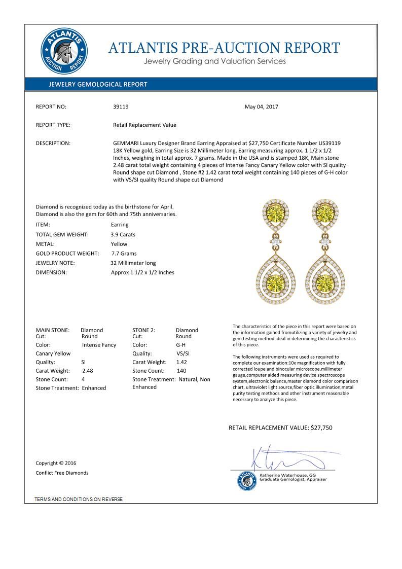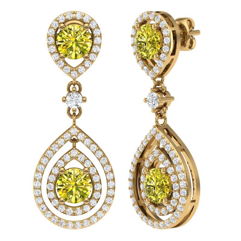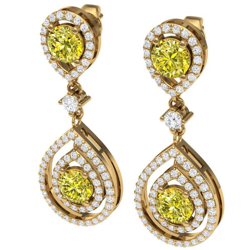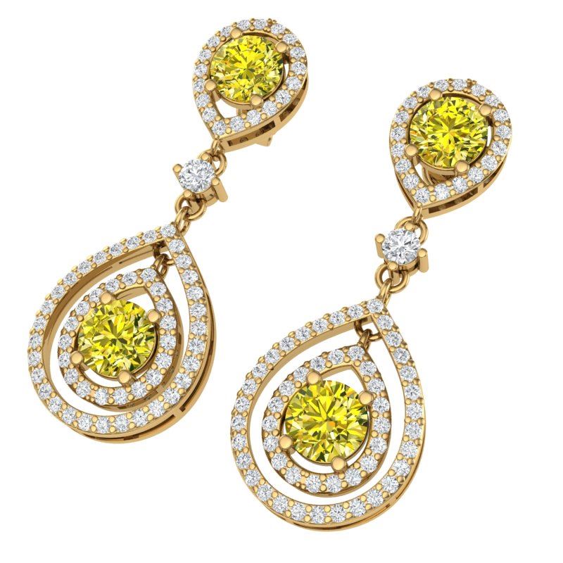 3.9 CTW Fancy Yellow SI Diamond Earrings 18K Yellow Gold ---- Luxury Designer Brand Earring Appraised Retail Price at $27,750 ---- SKU Number US39119 18K Yellow gold Earring Size is 32 Millimeter long, Earring measuring approx. 1 1/2 x 1/2 Inches, weighing in total approx. 7 grams. Made in the USA and is stamped 18K, Main stone 2.48 carat total weight containing 4 pieces of Intense Fancy Canary Yellow color with SI quality Round shape cut Diamond , Stone #2 1.42 carat total weight containing 140 pieces of G-H color with VS/SI quality Round shape cut