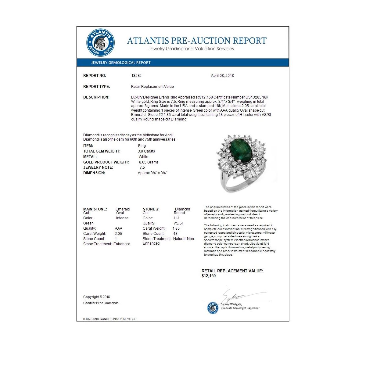 REF-170A2X -13285 ---- 3.90 CTW Emerald & Diamond Ring 18K White Gold ---- Luxury Designer Brand Ring Appraised at $12,150 Certificate Number US13285 18k White gold, Ring Size is 7.5, Ring measuring approx. 3/4" x 3/4" , weighing in total approx. 8 grams. Made in the USA and is stamped 18k, Main stone 2.05 carat total weight containing 1 pieces of Intense Green color with AAA quality Oval shape cut Emerald , Stone #2 1.85 carat total weight containing 48 pieces of H-I color with VS/SI quality Round shape cut Diamond