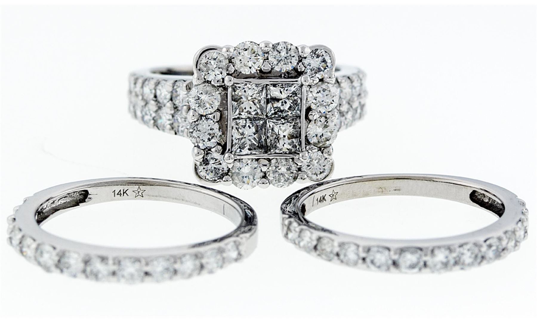 One Polished, stamped and tested 14K white gold three ring set with a bright finish. The rings are mounted with: 4 genuine square diamonds weighing approximately 0.68 carats, and 58 genuine round diamonds weighing approximately 3.22 carats. The set weighs 11.8 grams, condition is excellent, Identity: Natural Diamond, Shape: Square Round, Cutting Style: Brilliant Cut, Diamond Count: 62 Diamonds, Measurements 3.0 X 3.0mm (4 Square Diamonds) 2.0 - 3.0 MM (58 Round Diamonds), Total Weight: 3.90 carats, Color: G - H, Clarity: SI-SI2, Color Grade: G - H, Cut: Very Good, Refractive Index 2.417, Hardness: 10. This set comes with all three rings and includes an appraisal. AIGL Appraised at $11,728.00.