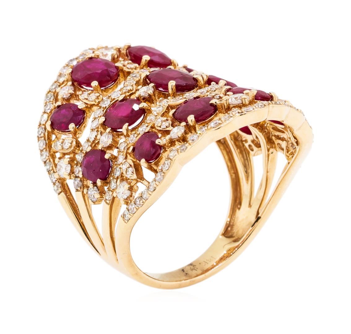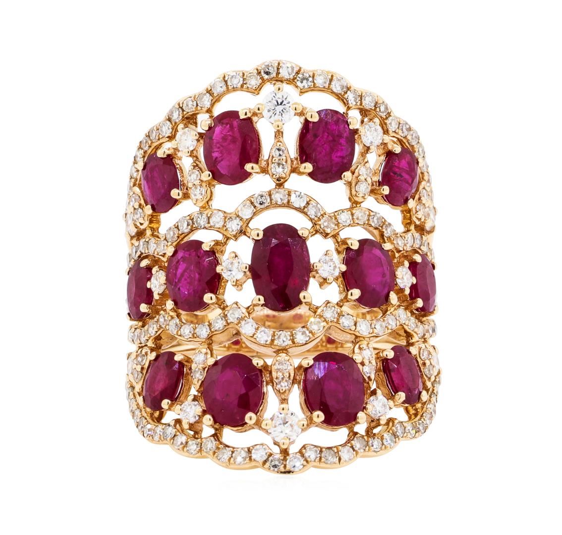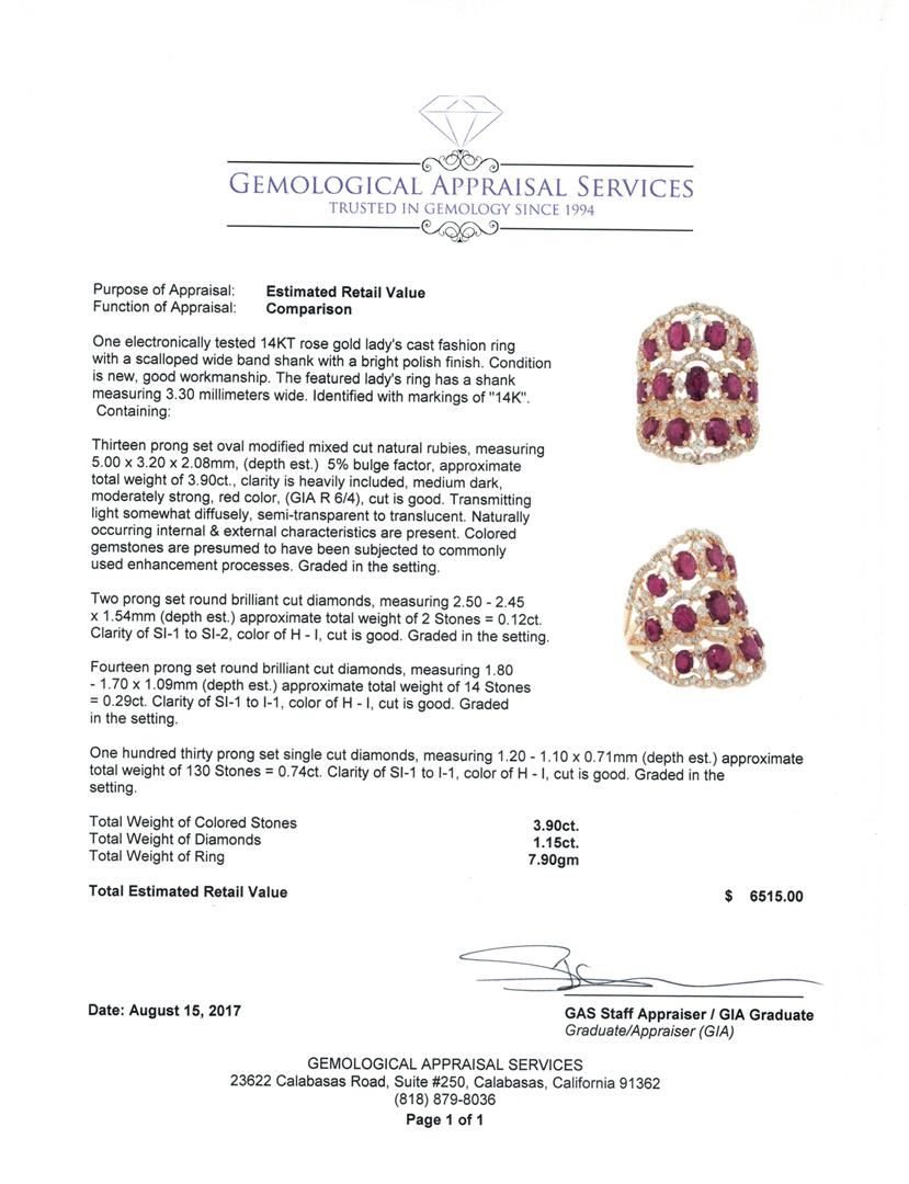 One electronically tested 14KT rose gold lady's cast fashion ring with a scalloped wide band shank with a bright polish finish. The featured lady's ring has a shank measuring 3.30 millimeters wide. Identified with markings of '14K'. Condition is new, good workmanship. Containing: Thirteen prong set oval modified mixed cut natural rubies, measuring 5.00 x 3.20 x 2.08mm, (depth est.) 5%. bulge factor, approximate total weight of 3.90ct., clarity is heavily included, medium dark, moderately strong, red color, (GIA R 6/4), cut is good. Transmitting light somewhat diffusely, semi-transparent to translucent. Naturally occurring internal & external characteristics are present. Colored gemstones are presumed to have been subjected to commonly used enhancement processes. Graded in the setting. Two prong set round brilliant cut diamonds, measuring 2.50 - 2.45 x 1.54mm (depth est.) approximate total weight of 2 Stones = 0.12ct. Graded in the setting. Color H - I Clarity SI-1 to SI-2 Cut Good Fourteen prong set round brilliant cut diamonds, measuring 1.80 - 1.70 x 1.09mm (depth est.) approximate total weight of 14 Stones = 0.29ct. Graded in the setting. Color H - I Clarity SI-1 to I-1 Cut Good One Hundred Thirty prong set single cut diamonds, measuring 1.20 - 1.10 x 0.71mm (depth est.) approximate total weight of 130 Stones = 0.74ct. Graded in the setting. Color H - I Clarity SI-1 to I-1 Cut Good. Total Weight of Colored Stones 3.90ct.. Total Weight of Diamonds 1.15ct.. Total Weight of Ring 7.90gm GAS Appraised at $6515.00. GAS Appraised at $6,515.00.