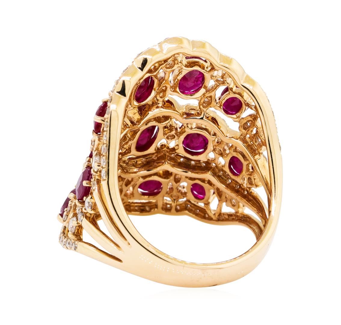 One electronically tested 14KT rose gold lady's cast fashion ring with a scalloped wide band shank with a bright polish finish. The featured lady's ring has a shank measuring 3.30 millimeters wide. Identified with markings of '14K'. Condition is new, good workmanship. Containing: Thirteen prong set oval modified mixed cut natural rubies, measuring 5.00 x 3.20 x 2.08mm, (depth est.) 5%. bulge factor, approximate total weight of 3.90ct., clarity is heavily included, medium dark, moderately strong, red color, (GIA R 6/4), cut is good. Transmitting light somewhat diffusely, semi-transparent to translucent. Naturally occurring internal & external characteristics are present. Colored gemstones are presumed to have been subjected to commonly used enhancement processes. Graded in the setting. Two prong set round brilliant cut diamonds, measuring 2.50 - 2.45 x 1.54mm (depth est.) approximate total weight of 2 Stones = 0.12ct. Graded in the setting. Color H - I Clarity SI-1 to SI-2 Cut Good Fourteen prong set round brilliant cut diamonds, measuring 1.80 - 1.70 x 1.09mm (depth est.) approximate total weight of 14 Stones = 0.29ct. Graded in the setting. Color H - I Clarity SI-1 to I-1 Cut Good One Hundred Thirty prong set single cut diamonds, measuring 1.20 - 1.10 x 0.71mm (depth est.) approximate total weight of 130 Stones = 0.74ct. Graded in the setting. Color H - I Clarity SI-1 to I-1 Cut Good. Total Weight of Colored Stones 3.90ct.. Total Weight of Diamonds 1.15ct.. Total Weight of Ring 7.90gm GAS Appraised at $6515.00. GAS Appraised at $6,515.00.