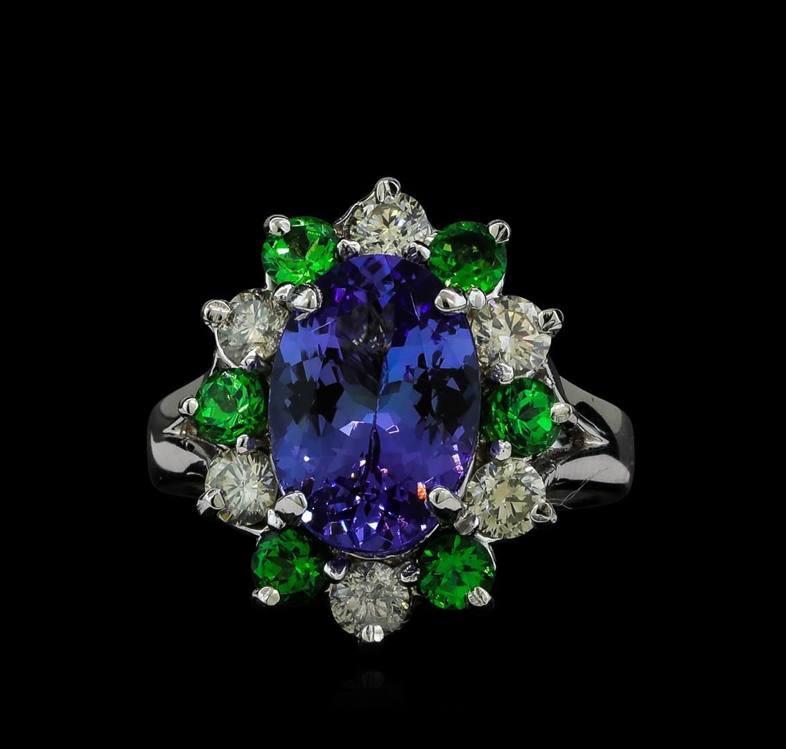 One electronically tested 14KT white gold lady's cast fashion ring with a basket halo with a bright polish finish. The featured lady's ring has a shank measuring 2.83 millimeters wide. Identified with markings of '14K'. Condition is new, good workmanship. Containing: One prong set oval modified brilliant cut natural tanzanite, measuring 12.16 x 8.49 x 5.20mm, (depth est.) approximate weight of 3.90ct., clarity is eye clean, medium light, moderately strong, violetish blue color, (GIA vB 4/4), cut is very good. Transmitting light with no distortion, transparent. Colored gemstones are presumed to have been subjected to commonly used enhancement processes. Graded in the setting. Six prong set round modified brilliant cut natural tsavorite garnets, measuring 3.25 - 3.15 x 2.09 mm, (depth est.) approximate total weight of 0.92ct., clarity is eye clean, medium dark, moderately strong, slightly yellowish green color, (GIA slyG 6/4), cut is good. Transmitting light with no distortion, transparent. Colored gemstones are presumed to have been subjected to commonly used enhancement processes. Graded in the setting. Six prong set round brilliant cut diamonds, measuring 3.30 - 3.20 x 1.98mm (depth est.) approximate total weight of 6 Stones = 0.77ct. Graded in the setting. Clarity SI-1 to I-1. Color: I - J Cut Good. Total Weight of Colored Stones 4.82ct.. Total Weight of Diamonds 0.77ct.. Total Weight of Ring 8.00gm. GAS Appraised at $8,840.00.
