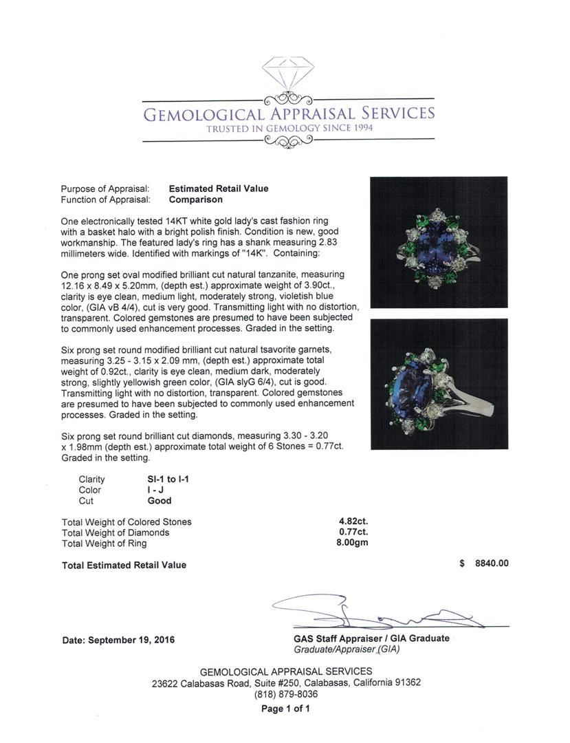 One electronically tested 14KT white gold lady's cast fashion ring with a basket halo with a bright polish finish. The featured lady's ring has a shank measuring 2.83 millimeters wide. Identified with markings of '14K'. Condition is new, good workmanship. Containing: One prong set oval modified brilliant cut natural tanzanite, measuring 12.16 x 8.49 x 5.20mm, (depth est.) approximate weight of 3.90ct., clarity is eye clean, medium light, moderately strong, violetish blue color, (GIA vB 4/4), cut is very good. Transmitting light with no distortion, transparent. Colored gemstones are presumed to have been subjected to commonly used enhancement processes. Graded in the setting. Six prong set round modified brilliant cut natural tsavorite garnets, measuring 3.25 - 3.15 x 2.09 mm, (depth est.) approximate total weight of 0.92ct., clarity is eye clean, medium dark, moderately strong, slightly yellowish green color, (GIA slyG 6/4), cut is good. Transmitting light with no distortion, transparent. Colored gemstones are presumed to have been subjected to commonly used enhancement processes. Graded in the setting. Six prong set round brilliant cut diamonds, measuring 3.30 - 3.20 x 1.98mm (depth est.) approximate total weight of 6 Stones = 0.77ct. Graded in the setting. Clarity SI-1 to I-1. Color: I - J Cut Good. Total Weight of Colored Stones 4.82ct.. Total Weight of Diamonds 0.77ct.. Total Weight of Ring 8.00gm. GAS Appraised at $8,840.00.