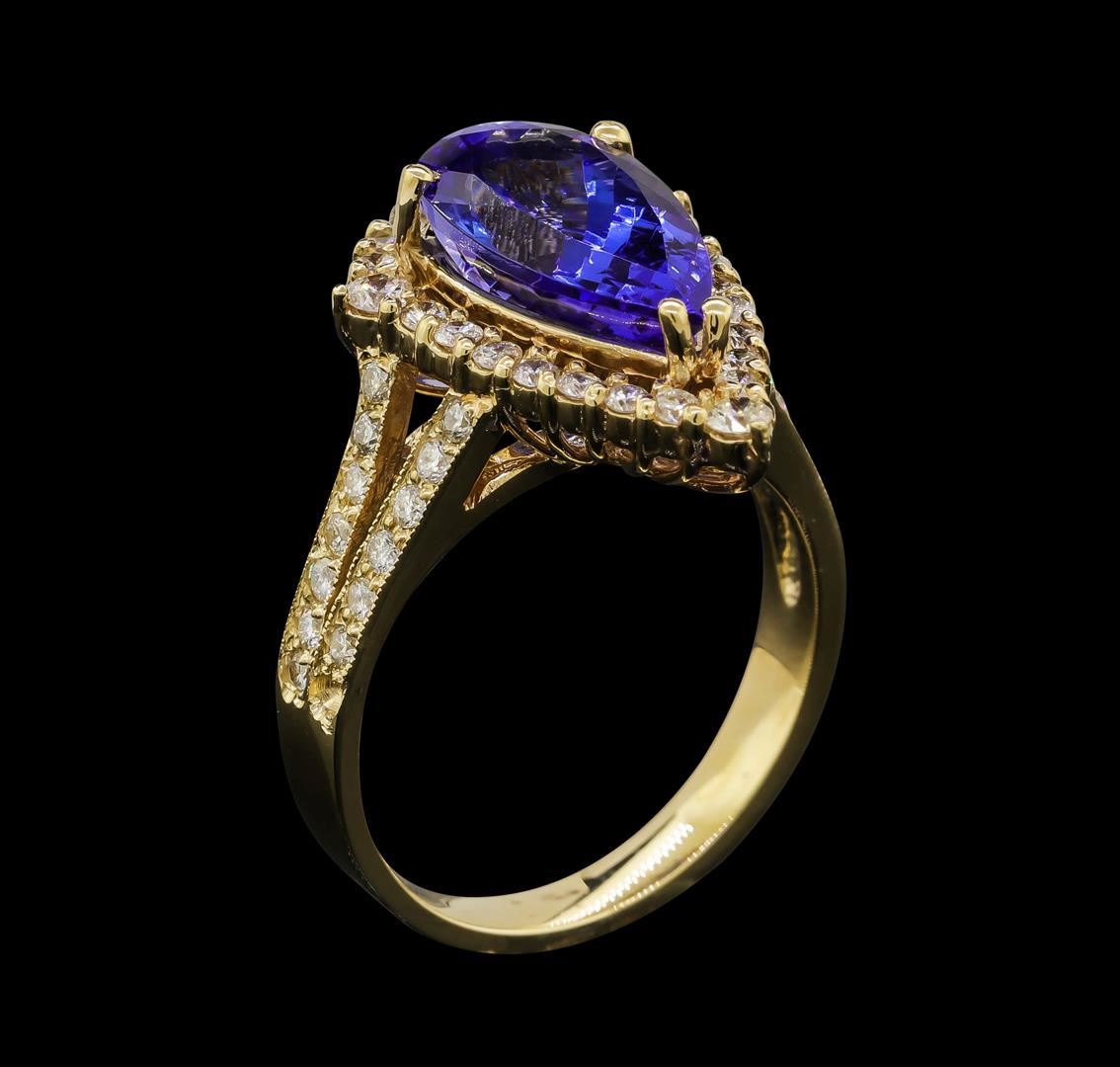 One electronically tested 14KT yellow gold lady's cast fashion ring with a split shank basket halo with a bright polish with milgrain detailing finish. The featured lady's ring has a shank measuring 2.69 millimeters wide. Identified with markings of 'K14'. Condition is new, good workmanship. Containing: One prong set pear modified brilliant cut natural tanzanite, measuring 13.60 x 7.57 x 5.70mm, (depth est.) approximate weight of 3.90ct., clarity is eye clean, medium dark, moderately strong, violetish blue color, (GIA vB 6/4), cut is very good. Transmitting light with no distortion, transparent. Colored gemstones are presumed to have been subjected to commonly used enhancement processes. Graded in the setting. Four prong set round brilliant cut diamonds, measuring 2.30 - 2.20 x 1.37mm (depth est.) approximate total weight of 4 Stones = 0.17ct. Graded in the setting. Clarity VS-2 to SI-2. Color: H - I Cut Good Forty-Eight prong set round brilliant cut diamonds, measuring 1.60 - 1.45 x 0.95mm (depth est.) approximate total weight of 48 Stones = 0.65ct. Graded in the setting. Clarity SI-1 to I-1. Color: G - I Cut Good. Total Weight of Colored Stones 3.90ct.. Total Weight of Diamonds 0.82ct.. Total Weight of Ring 5.90gm. GAS Appraised at $9,795.00.