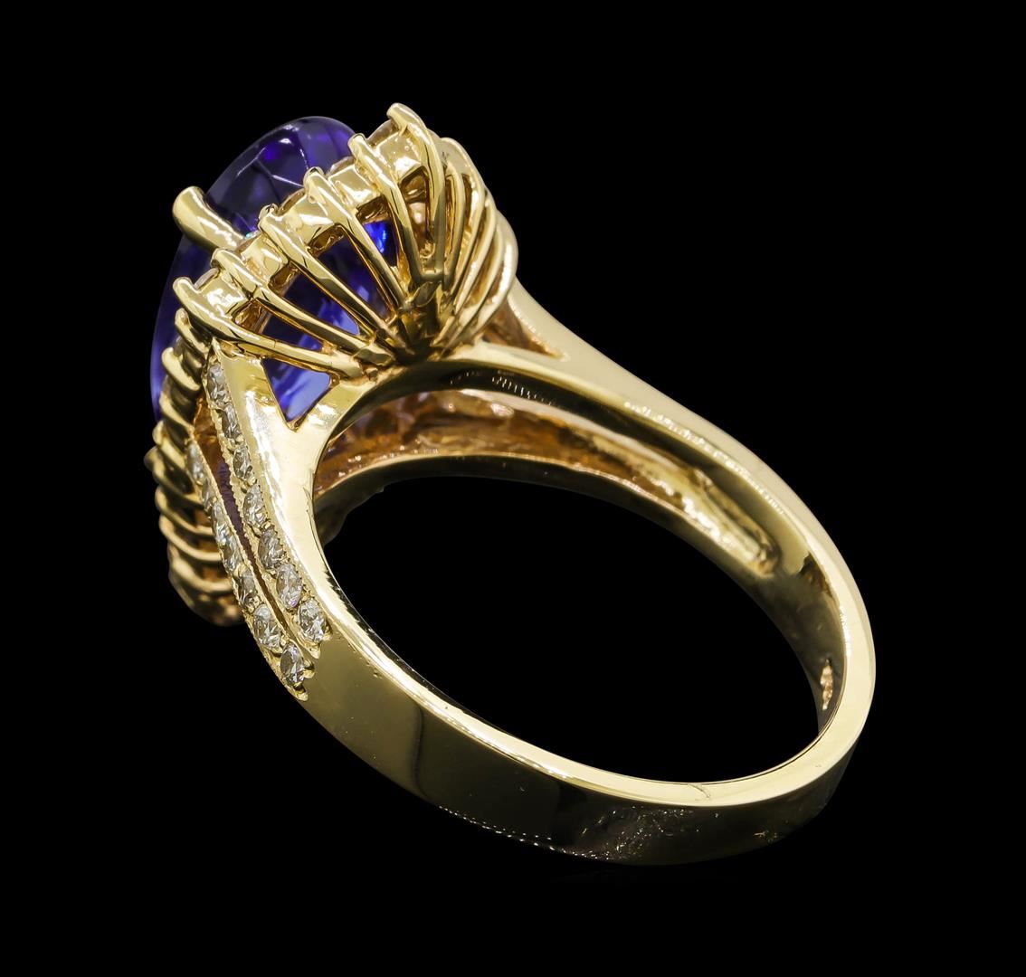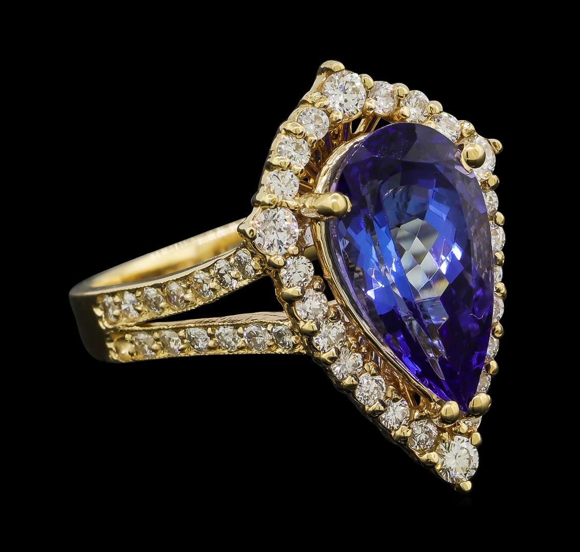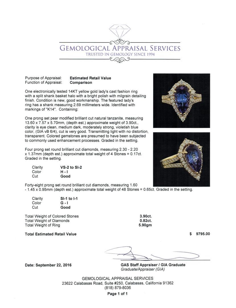 One electronically tested 14KT yellow gold lady's cast fashion ring with a split shank basket halo with a bright polish with milgrain detailing finish. The featured lady's ring has a shank measuring 2.69 millimeters wide. Identified with markings of 'K14'. Condition is new, good workmanship. Containing: One prong set pear modified brilliant cut natural tanzanite, measuring 13.60 x 7.57 x 5.70mm, (depth est.) approximate weight of 3.90ct., clarity is eye clean, medium dark, moderately strong, violetish blue color, (GIA vB 6/4), cut is very good. Transmitting light with no distortion, transparent. Colored gemstones are presumed to have been subjected to commonly used enhancement processes. Graded in the setting. Four prong set round brilliant cut diamonds, measuring 2.30 - 2.20 x 1.37mm (depth est.) approximate total weight of 4 Stones = 0.17ct. Graded in the setting. Clarity VS-2 to SI-2. Color: H - I Cut Good Forty-Eight prong set round brilliant cut diamonds, measuring 1.60 - 1.45 x 0.95mm (depth est.) approximate total weight of 48 Stones = 0.65ct. Graded in the setting. Clarity SI-1 to I-1. Color: G - I Cut Good. Total Weight of Colored Stones 3.90ct.. Total Weight of Diamonds 0.82ct.. Total Weight of Ring 5.90gm. GAS Appraised at $9,795.00.