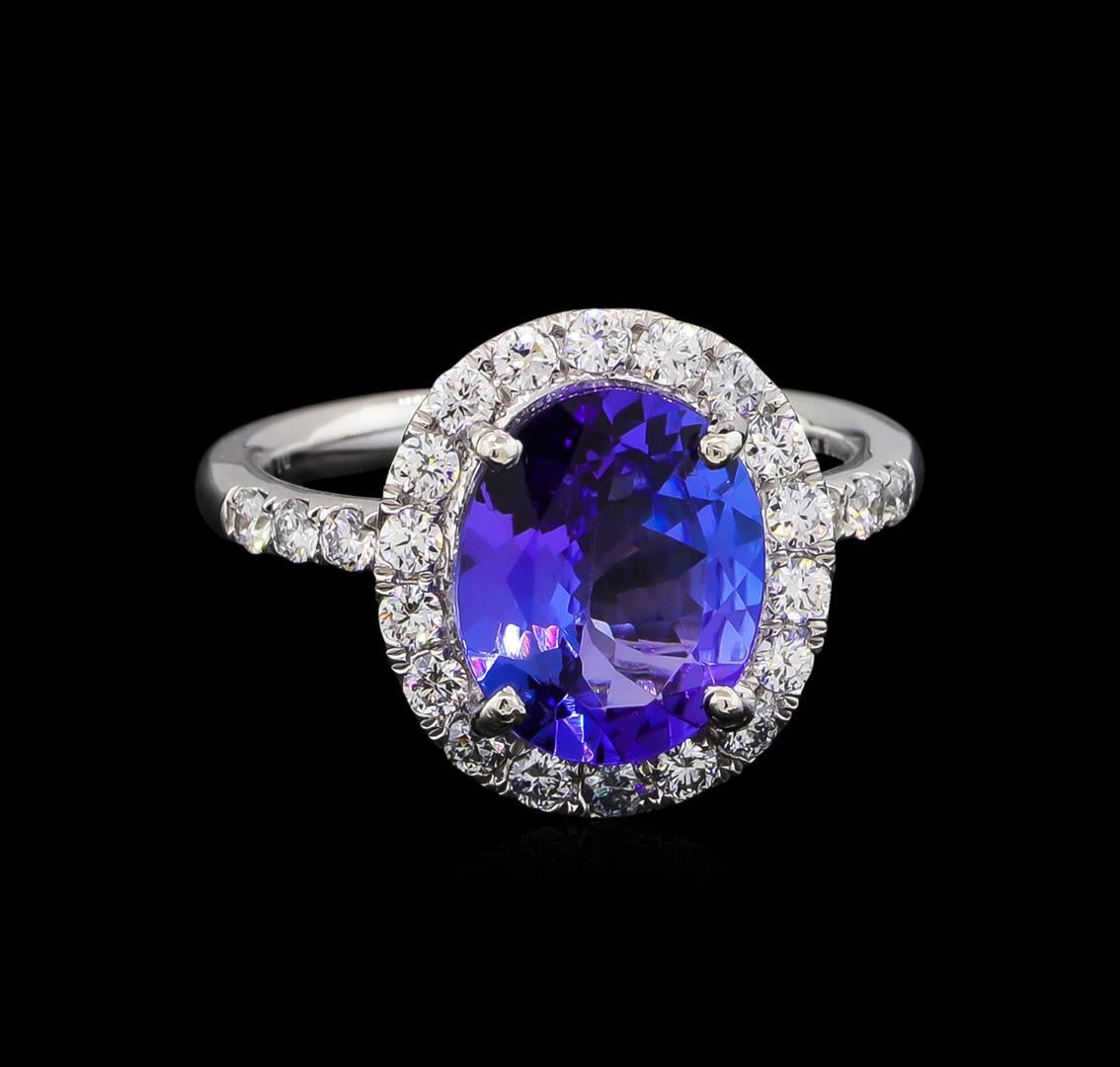 One electronically tested platinum lady's cast fashion ring with a cathedral halo with a bright polish finish. The featured lady's ring has a shank measuring 2.57 millimeters wide. Trademark is Orianne. Identified with markings of "PT 950". Condition is new, good workmanship. Containing: One prong set oval modified brilliant cut natural tanzanite, measuring 11.15 x 9.03 x 5.08mm, 8%. bulge factor, approximate weight of 3.90ct., clarity is eye clean, type I, medium dark, moderately strong, violetish blue color, (GIA vB 6/4), cut is excellent. Transmitting light with no distortion, transparent. Colored gemstones are presumed to have been subjected to commonly used enhancement processes. Graded in the setting. Forty prong set round brilliant cut diamonds, measuring 1.95 - 1.85 x 1.18mm (depth est.) approximate total weight of 40 Stones = 1.05ct. Graded in the setting. Clarity: VS-2 to SI-1. Color: F - Very Good. Total Weight of Colored Stones 3.90ct. Total Weight of Diamonds 1.05ct. Total Weight of Ring 7.80gm. GAS Appraised at $11,635.00.