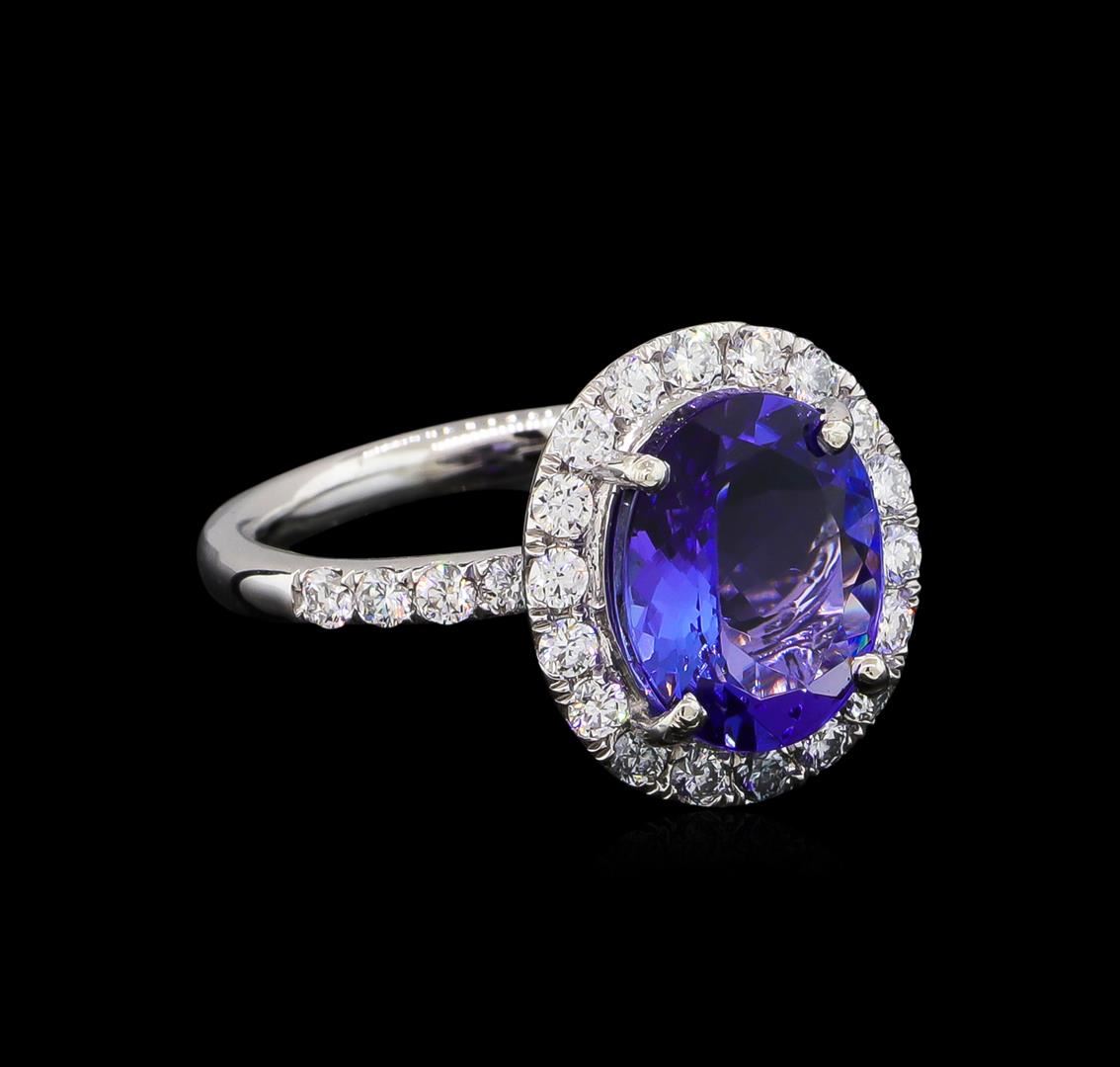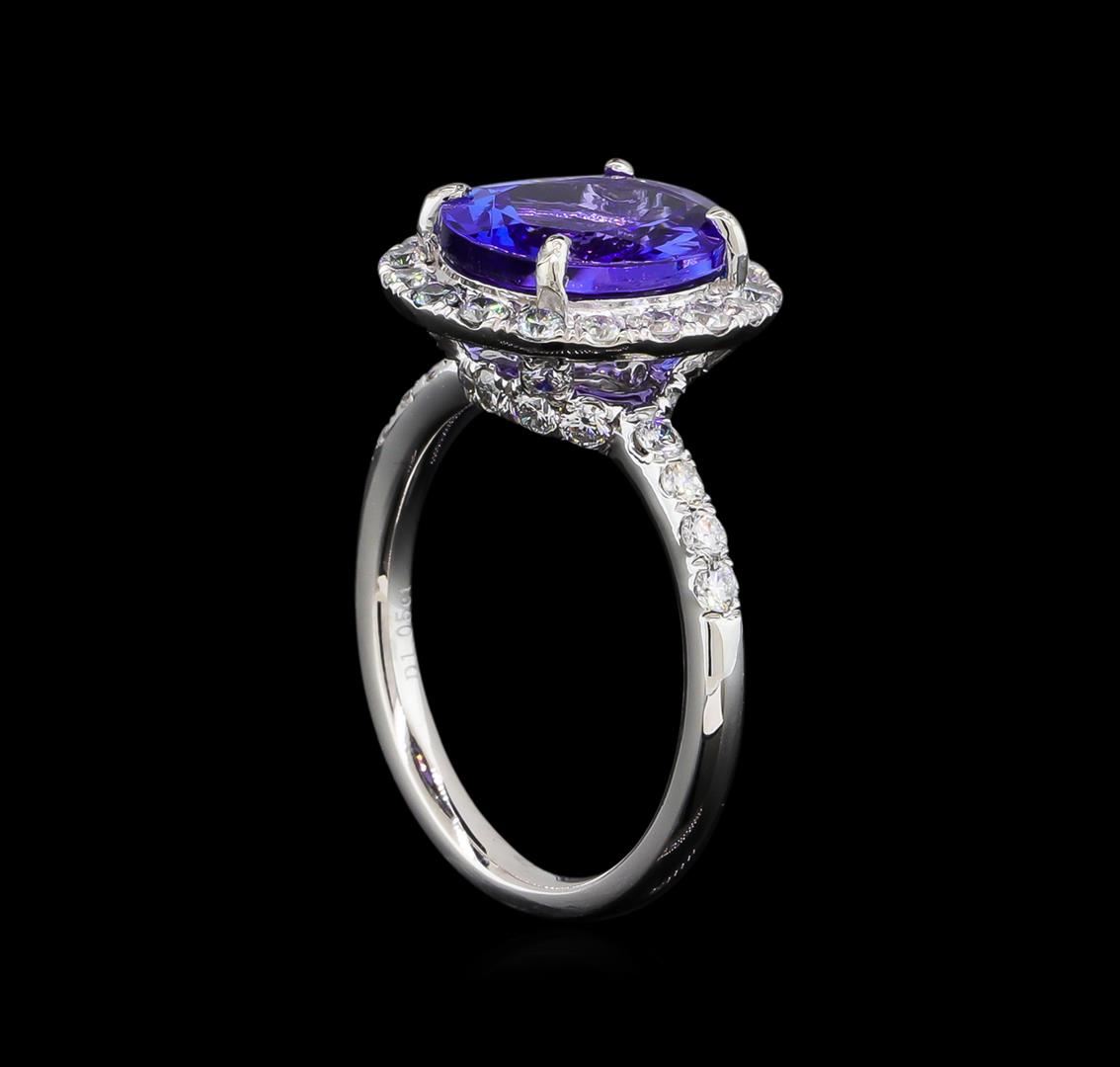 One electronically tested platinum lady's cast fashion ring with a cathedral halo with a bright polish finish. The featured lady's ring has a shank measuring 2.57 millimeters wide. Trademark is Orianne. Identified with markings of "PT 950". Condition is new, good workmanship. Containing: One prong set oval modified brilliant cut natural tanzanite, measuring 11.15 x 9.03 x 5.08mm, 8%. bulge factor, approximate weight of 3.90ct., clarity is eye clean, type I, medium dark, moderately strong, violetish blue color, (GIA vB 6/4), cut is excellent. Transmitting light with no distortion, transparent. Colored gemstones are presumed to have been subjected to commonly used enhancement processes. Graded in the setting. Forty prong set round brilliant cut diamonds, measuring 1.95 - 1.85 x 1.18mm (depth est.) approximate total weight of 40 Stones = 1.05ct. Graded in the setting. Clarity: VS-2 to SI-1. Color: F - Very Good. Total Weight of Colored Stones 3.90ct. Total Weight of Diamonds 1.05ct. Total Weight of Ring 7.80gm. GAS Appraised at $11,635.00.