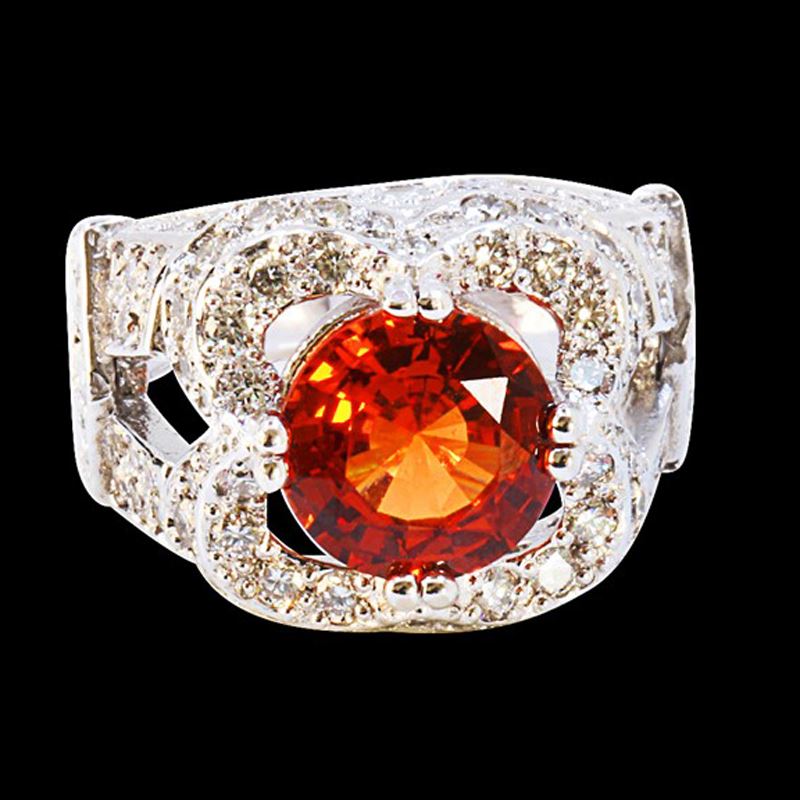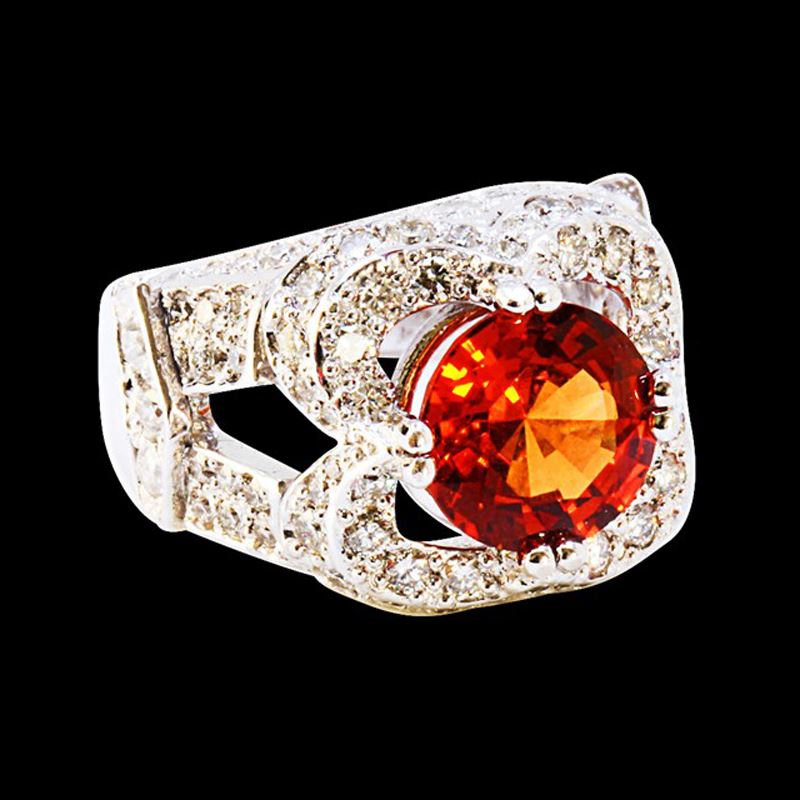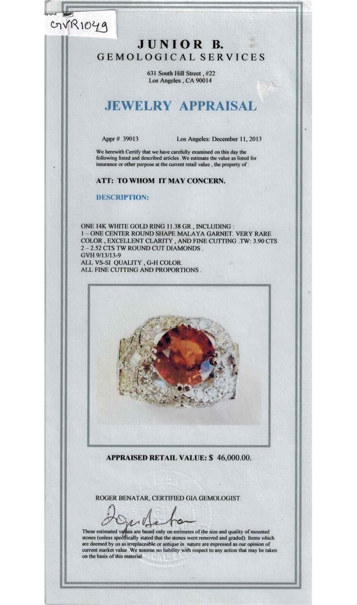 14K WHITE GOLD NATURAL MALAYA GARNET RING:12.70 GRAMS/DIAMOND:2.52CT/MALAYA GARNET:3.90CT/#GVR1049/ MALAYA GARNET IS THE VERY RARE GARNET IN THE GARNET FAMILY. VERY HARD TO FIND THIS KIND OF COLOR AND QULAITY