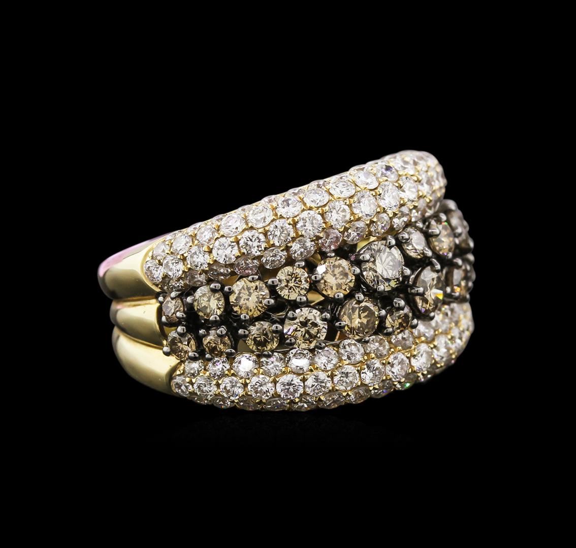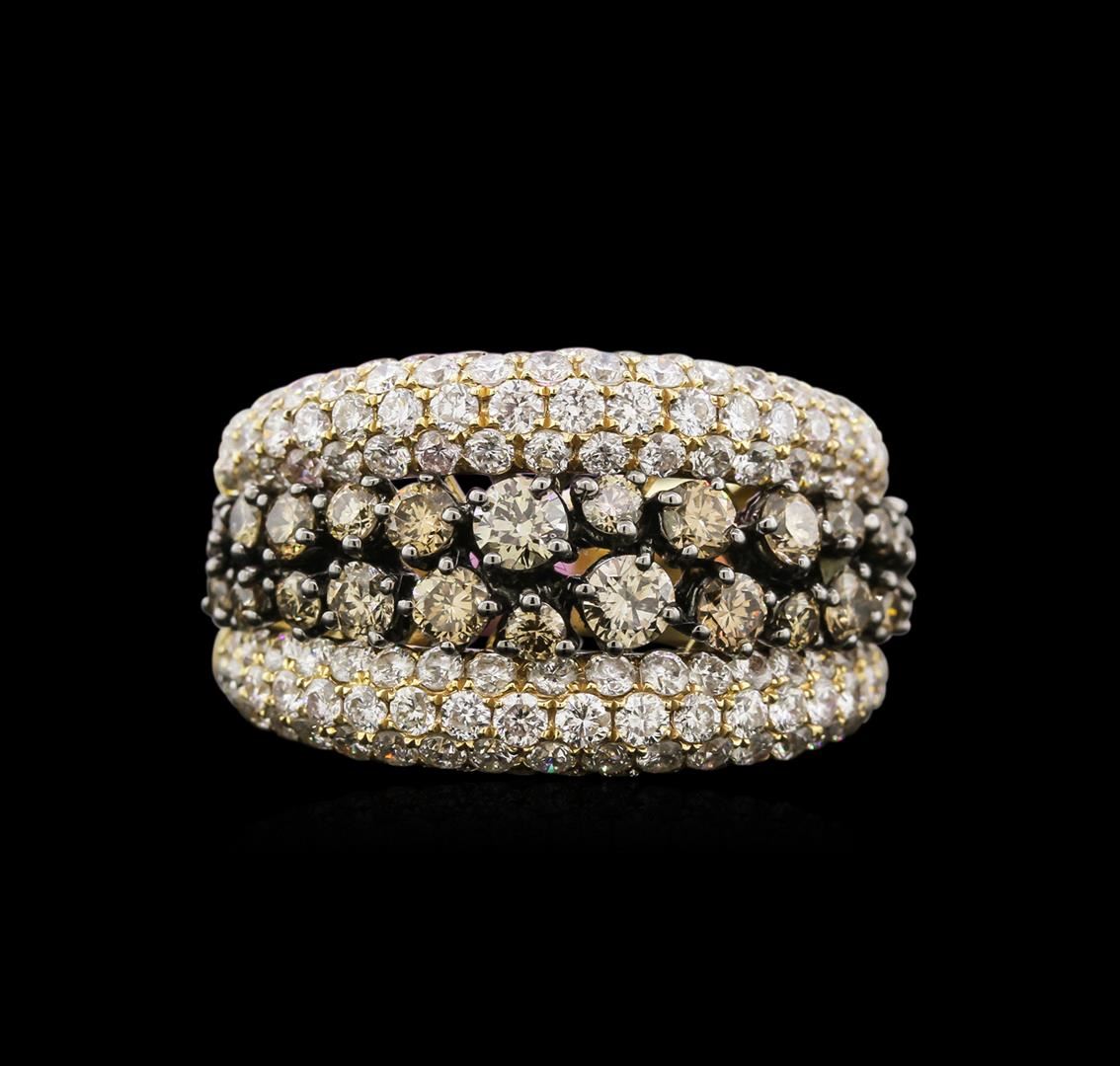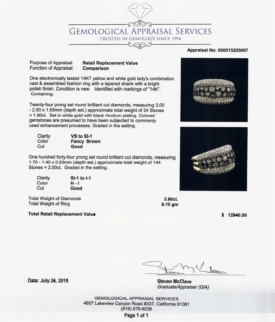 One electronically tested 14KT yellow and white gold lady's combination cast & assembled fashion ring with a tapered shank with a bright polish finish. Condition is new. Identified with markings of "14K". Containing: Twenty-four prong set round brilliant cut diamonds, measuring 3.00 - 2.50 x 1.65mm (depth est.) approximate total weight of 24 Stones = 1.90ct. Set in white gold with black rhodium plating. Colored gemstones are presumed to have been subjected to commonly used enhancement processes. Graded in the setting. Clarity VS to SI-1. Color: Fancy Brown. Cut: Good. One hundred forty-four prong set round brilliant cut diamonds, measuring 1.70 - 1.40 x 0.93mm (depth est.) Approximate total weight of 144 Stones = 2.00ct. Graded in the setting. Clarity: SI-1 to I-1. Color: H - I. Cut: Good. Total Weight of Diamonds: 3.90ct. Total Weight of Ring: 9.10 gm. GAS Appraised at $12,940.00.