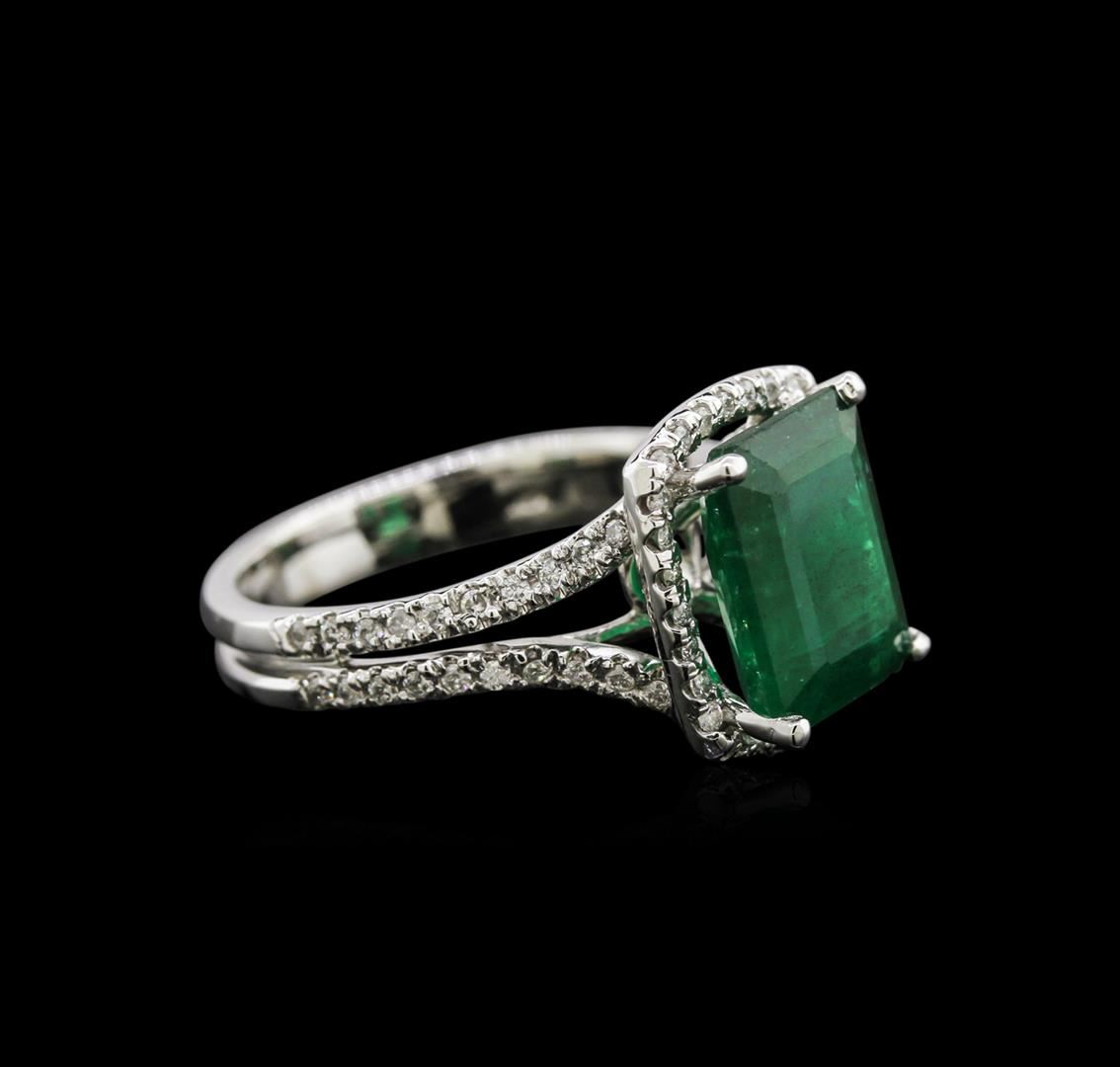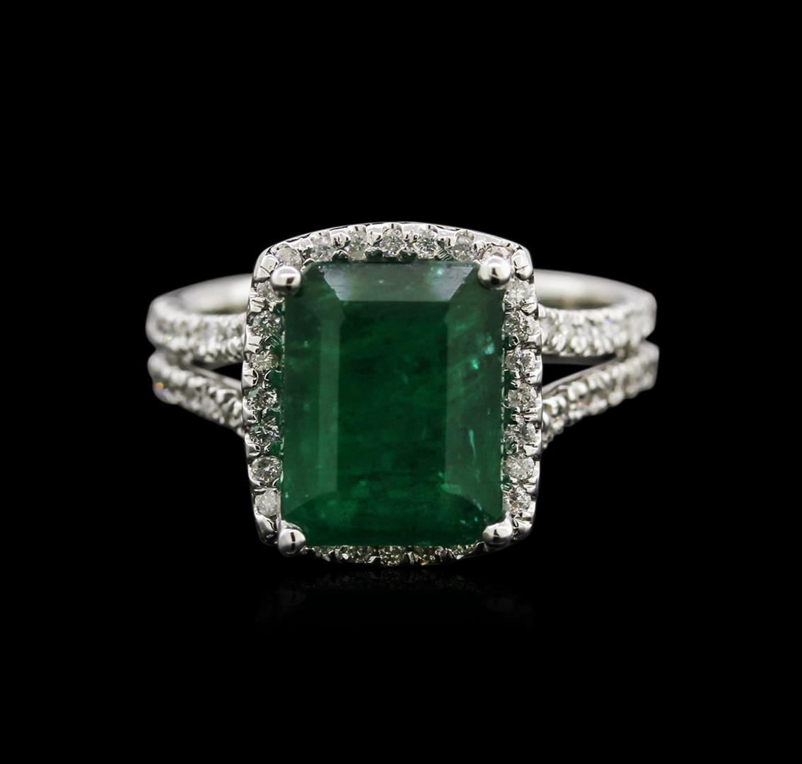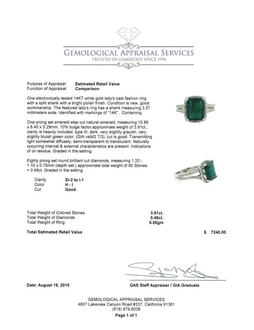One electronically tested 14KT white gold lady's cast fashion ring with a split shank with a bright polish finish. The featured lady's ring has a shank measuring 3.57 millimeters wide. Identified with markings of "14K". Condition is new, good workmanship. Containing: One prong set emerald step cut natural emerald, measuring 10.88 x 8.40 x 5.29mm, 10% bulge factor, approximate weight of 3.91ct., clarity is heavily included, type III, dark, very slightly grayish, very slightly bluish green color, (GIA vslbG 7/3), cut is good. Transmitting light somewhat diffusely, semi-transparent to translucent. Naturally occurring internal & external characteristics are present. Indications of oil residue. Graded in the setting. Eighty prong set round brilliant cut diamonds, measuring 1.20 - 1.10 x 0.75mm (depth est.) approximate total weight of 80 Stones = 0.48ct. Graded in the setting. Clarity: SI-2 to I-1. Color: H - I. Cut Good. Total Weight of Colored Stones 3.91ct. Total Weight of Diamonds 0.48ct. Total Weight of Ring 5.50gm. GAS Appraised at $7,240.00.