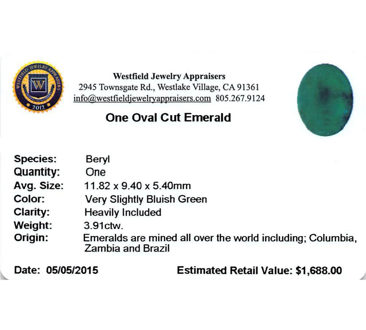 One oval mixed cut natural emerald, measuring 11.82 x 9.40 x 5.40mm, approximate weight of 3.91ct., clarity is heavily included, type III, medium dark, very slightly grayish, very slightly bluish green color, (GIA vslbG 6/3), cut is good. Indications of multiple laboratory enhancements, including high temperature heat treatment. Westfield Appraised at $1,688.00.