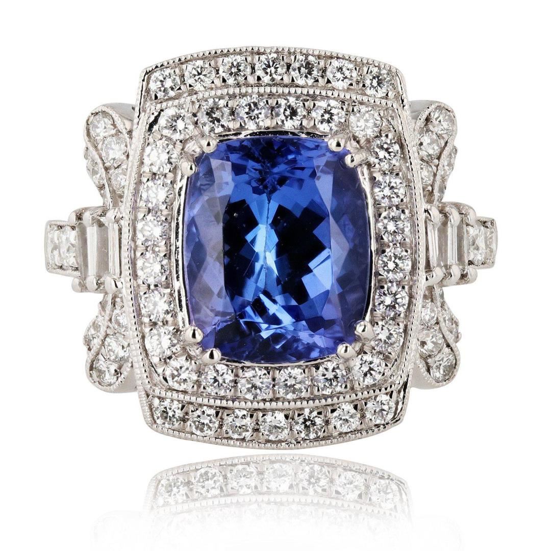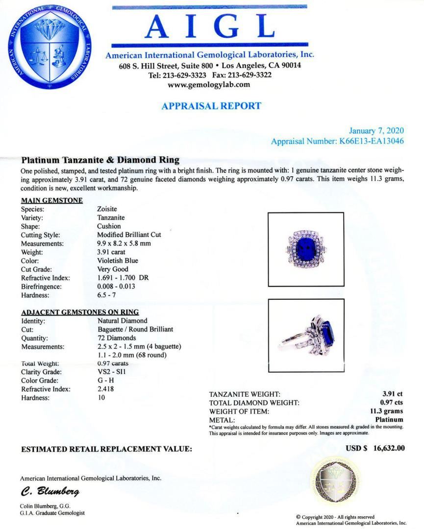 Platinum Tanzanite & Diamond Ring One polished, stamped, and tested platinum ring with a bright finish. The ring is mounted with: 1 genuine tanzanite center stone weighing approximately 3.91 carat, and 72 genuine faceted diamonds weighing approximately 0.97 carats. This item weighs 11.3 grams, condition is new, excellent workmanship. MAIN GEMSTONE Species: Zoisite Variety: Tanzanite Shape: Cushion Cutting Style: Modified Brilliant Cut Measurements: 9.9 x 8.2 x 5.8 mm Weight: 3.91 carat Color: Violetish Blue Cut Grade: Very Good Refractive Index: 1.691 - 1.700 DR Birefringence: 0.008 - 0.013 Hardness: 6.5 - 7 ADJACENT GEMSTONES ON RING Identity: Natural Diamond Cut: Baguette / Round Brilliant Quantity: 72 Diamonds Measurements: 2.5 x 2 - 1.5mm (4 baguette) 1.1 - 2.0mm (68 round) Total Weight: 0.97 carats Clarity Grade: VS2 to SI1 Color Grade: G - H Refractive Index: 2.418 Hardness: 10 TANZANITE WEIGHT: 3.91ct TOTAL DIAMOND WEIGHT: 0.97ctw WEIGHT OF ITEM: 11.3 grams METAL: Platinum