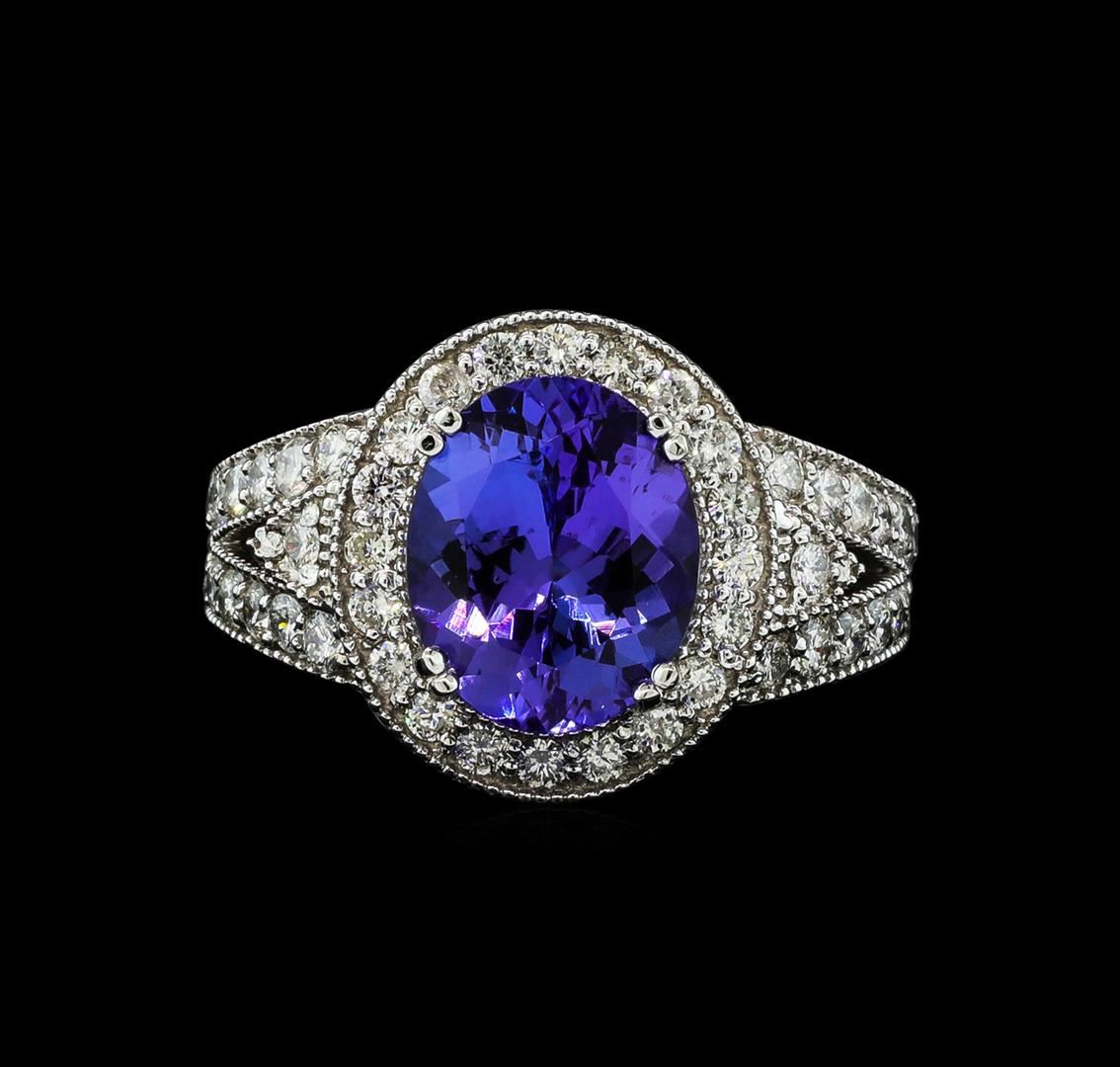 One electronically tested 14KT white gold lady's cast fashion ring with a split shank halo with a bright polish with milgrain detailing finish. The featured lady's ring has a shank measuring 3.70 millimeters wide. Identified with markings of 'K14'. Condition is new, good workmanship. Containing: One prong set oval modified brilliant cut natural tanzanite, measuring 11.10 x 9.09 x 5.72mm, (depth est.) approximate weight of 3.91ct., clarity is eye clean, medium, moderately strong, bluish violet color, (GIA bV 5/4), cut is very good. Transmitting light with no distortion, transparent. Colored gemstones are presumed to have been subjected to commonly used enhancement processes. Graded in the setting. Twenty-Six prong set round brilliant cut diamonds, measuring 1.95 - 1.85 x 1.18mm (depth est.) approximate total weight of 26 Stones = 0.67ct. Graded in the setting. Clarity SI-1 to I-1. Color: H - I Cut Good Twenty prong set round brilliant cut diamonds, measuring 1.80 - 1.70 x 1.07mm (depth est.) approximate total weight of 20 Stones = 0.40ct. Graded in the setting. Clarity SI-1 to I-1. Color: H - I Cut Good. Total Weight of Colored Stones 3.91ct.. Total Weight of Diamonds 1.07ct.. Total Weight of Ring 8.10gm GAS Appraised at $9,870.00.