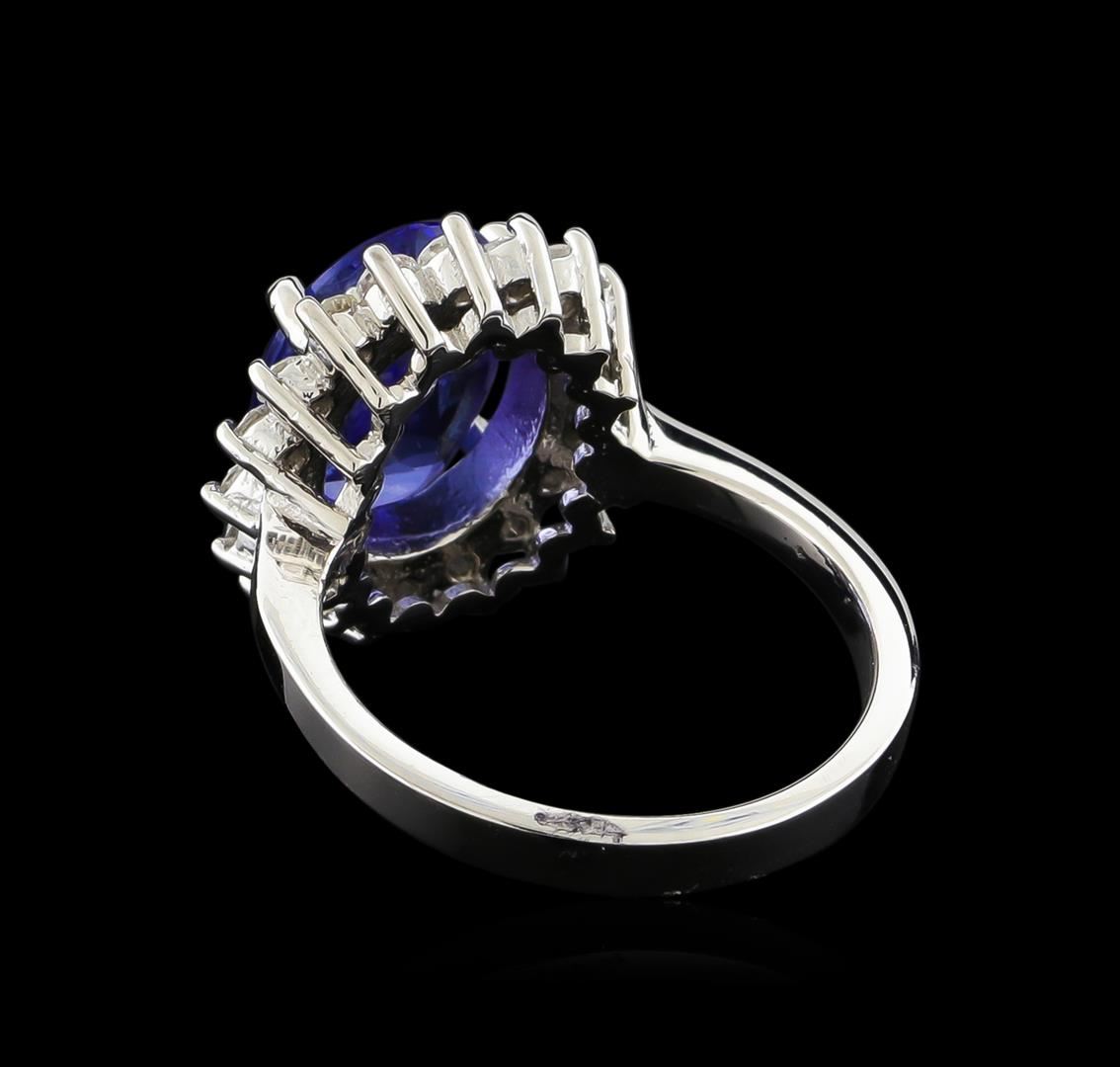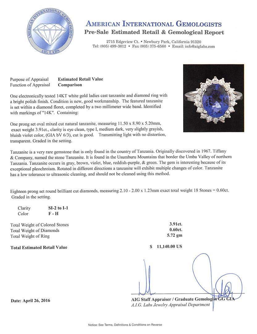 One electronically tested 14KT white gold ladies cast tanzanite and diamond ring with a bright polish finish. The featured tanzanite is set within a diamond floret, completed by a two millimeter wide band. Identified with markings of "14K". Condition is new, good workmanship. Containing: One prong set oval mixed cut natural tanzanite, measuring 11.50 x 8.90 x 5.20mm, exact weight 3.91ct., clarity is eye clean, type I, medium dark, very slightly grayish, bluish violet color, (GIA bV 6/3), cut is good. Transmitting light with no distortion, transparent. Graded in the setting. Tanzanite is a very rare gemstone that is only found in the country of Tanzania. Originally discovered in 1967. Tiffany & Company, named the stone Tanzanite. It is found in the Usumburu Mountains that border the Umba Valley of northern Tanzania. Tanzanite occurs in gray, brown, violet, blue, reddish-purple, & green. The gem is interesting because of its exceptional pleochroism. Rotated in different directions a tanzanite will exhibit multiple changes of color. Tanzanite has a low tolerance to ultrasonic cleaning, and should not be cleaned using this method. Eighteen prong set round brilliant cut diamonds, measuring 2.10 - 2.00 x 1.23mm exact total weight 18 Stones = 0.60ct. Graded in the setting. Clarity: SI-2 to I-1. Color: F - H. Total Weight of Colored Stones 3.91ct. Total Weight of Diamonds 0.60ct. Total Weight of Ring 5.72gm. AIG Appraised at $11,140.00.