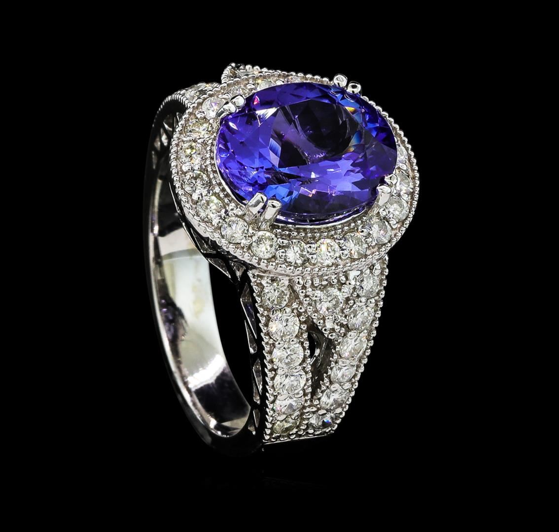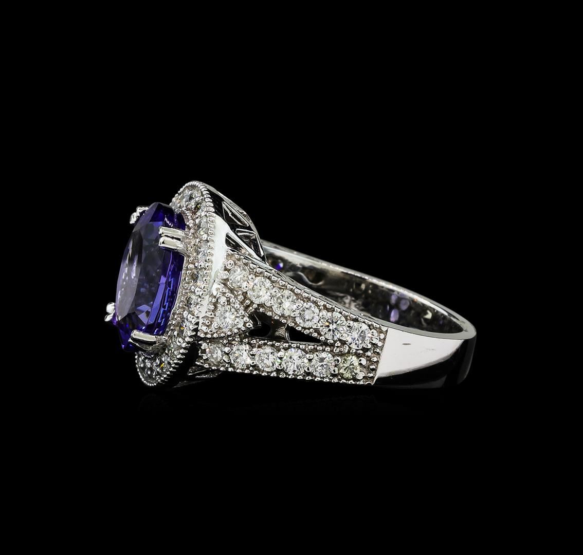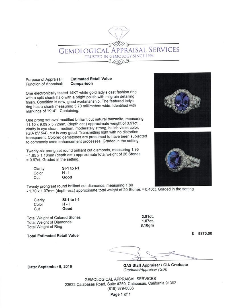 One electronically tested 14KT white gold lady's cast fashion ring with a split shank halo with a bright polish with milgrain detailing finish. The featured lady's ring has a shank measuring 3.70 millimeters wide. Identified with markings of 'K14'. Condition is new, good workmanship. Containing: One prong set oval modified brilliant cut natural tanzanite, measuring 11.10 x 9.09 x 5.72mm, (depth est.) approximate weight of 3.91ct., clarity is eye clean, medium, moderately strong, bluish violet color, (GIA bV 5/4), cut is very good. Transmitting light with no distortion, transparent. Colored gemstones are presumed to have been subjected to commonly used enhancement processes. Graded in the setting. Twenty-Six prong set round brilliant cut diamonds, measuring 1.95 - 1.85 x 1.18mm (depth est.) approximate total weight of 26 Stones = 0.67ct. Graded in the setting. Clarity SI-1 to I-1. Color: H - I Cut Good Twenty prong set round brilliant cut diamonds, measuring 1.80 - 1.70 x 1.07mm (depth est.) approximate total weight of 20 Stones = 0.40ct. Graded in the setting. Clarity SI-1 to I-1. Color: H - I Cut Good. Total Weight of Colored Stones 3.91ct.. Total Weight of Diamonds 1.07ct.. Total Weight of Ring 8.10gm GAS Appraised at $9,870.00.