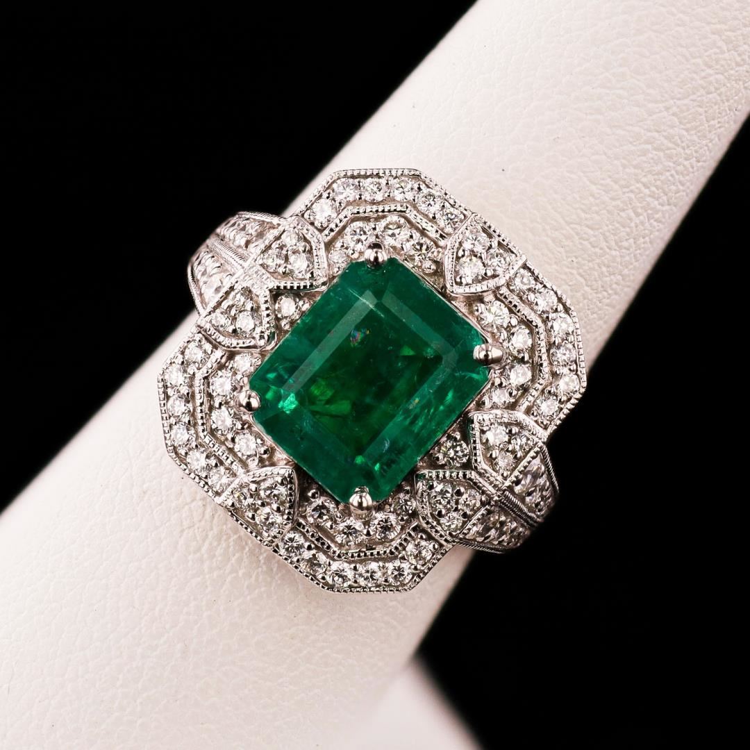 One polished, stamped, and tested platinum ring marked Oscar Friedman. The ring is mounted with: 1 genuine GIA certified emerald center stone weighing 3.92 carats, and 80 genuine round diamonds weighing approximately 0.85 carats. This item weighs 10.8 grams, condition is new, excellent workmanship. #MAIN GEMSTONE# GIA Report No.: 5231438556; Species: Natural Beryl; Variety: Emerald; Shape: Octagonal; Cutting Style: Step Cut; Measurements: 9.94 x 8.24 x 6.04mm; Weight: 3.92 carats; Color: Green; Transparency: Transparent; Treatment: Moderate (F2); Refractive Index: 1.564 - 1.595 DR; Birefringence: 0.005 to 0.009; Hardness: 7.5 - 8 #ADJACENT GEMSTONES ON RING# Identity: Natural Diamond; Shape: Round; Cutting Style: Brilliant Cut; Quantity: 80 Diamonds; Measurements: 1.0 - 2.0mm; Total Weight: 0.85 carats; Color Grade: F-G; Clarity Grade: VS2-SI1; Refractive Index: 2.417; Hardness: 10 #EMERALD WEIGHT: 3.92 ct; TOTAL DIAMOND WEIGHT: 0.85 cts; WEIGHT OF ITEM: 10.8 grams; METAL: Platinum #Size: 7