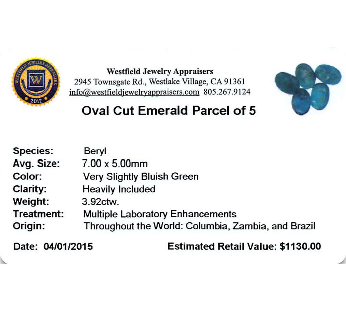 Five oval mixed cut natural emeralds exact total weight 3.92ct., clarity is heavily included, type III, medium dark, very slightly grayish, very slightly bluish green color, (GIA vslbG 6/3), cut is good. Westfield Appraised at $1,130.00.