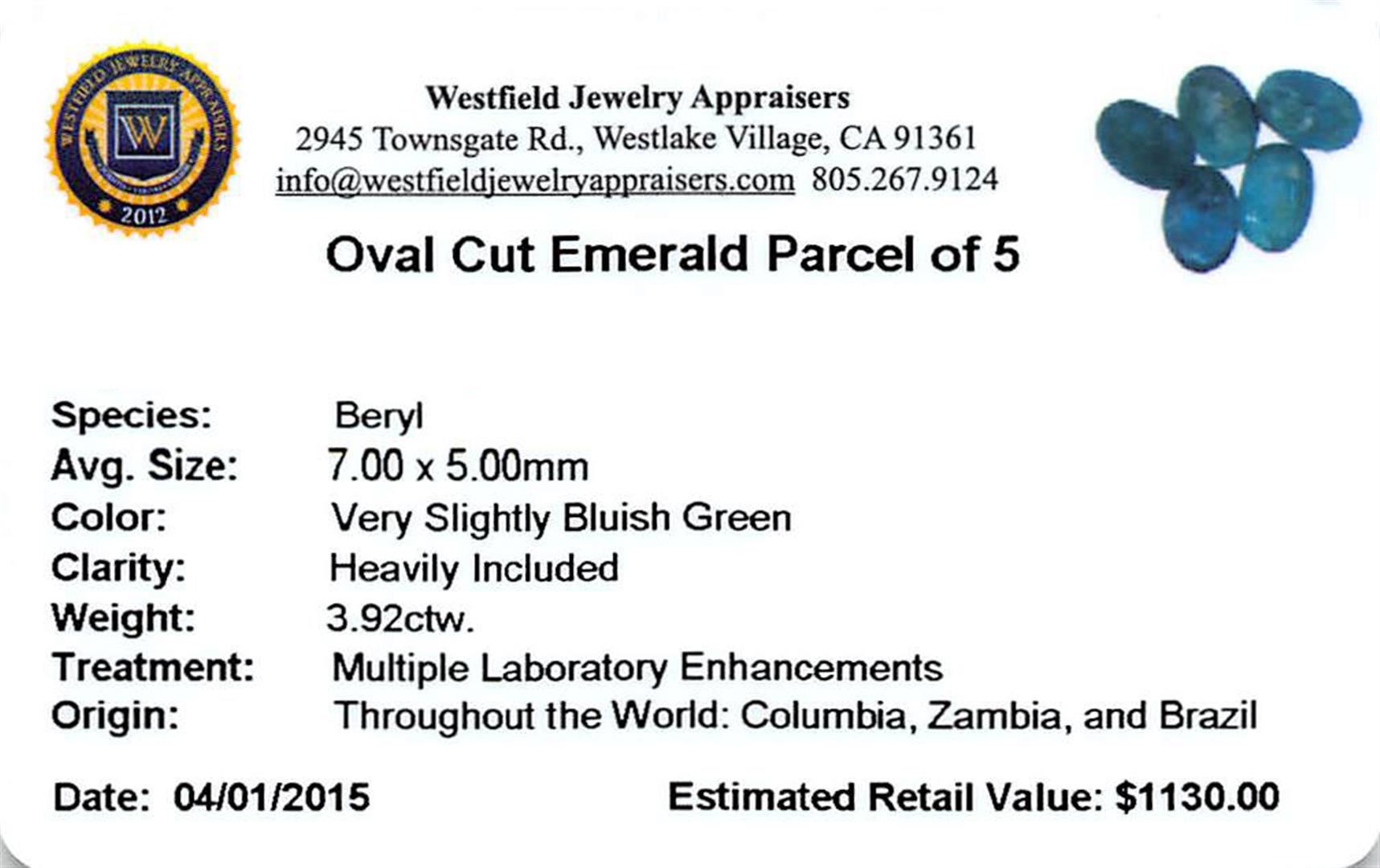 Five oval mixed cut natural emeralds exact total weight 3.92ct., clarity is heavily included, type III, medium dark, very slightly grayish, very slightly bluish green color, (GIA vslbG 6/3), cut is good. Westfield Appraised at $1,130.00.