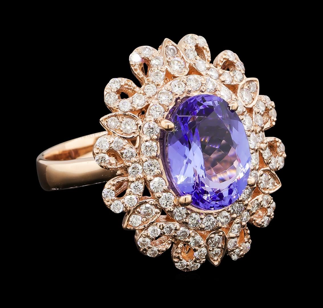 One electronically tested 14KT rose gold lady's cast fashion ring with a scalloped double basket halo with a bright polish finish. The featured lady's ring has a shank measuring 3.88 millimeters wide. Identified with markings of 'K14'. Condition is new, good workmanship. Containing: One prong set oval modified brilliant cut natural tanzanite, measuring 11.15 x 8.96 x 5.32mm, (depth est.) 5%. bulge factor, approximate weight of 3.92ct., clarity is eye clean, medium, moderately strong, violet color, (GIA V 5/4), cut is good. Transmitting light with no distortion, transparent. Colored gemstones are presumed to have been subjected to commonly used enhancement processes. Graded in the setting. Twenty-Eight prong set round brilliant cut diamonds, measuring 1.60 - 1.50 x 0.96mm (depth est.) approximate total weight of 28 Stones = 0.40ct. Graded in the setting. Clarity SI-1 to SI-2. Color: H - I Cut Good Forty-Eight prong set round brilliant cut diamonds, measuring 1.40 - 1.35 x 0.86mm (depth est.) approximate total weight of 48 Stones = 0.48ct. Graded in the setting. Clarity SI-1 to I-1. Color: H - I Cut Good Twelve prong set round brilliant cut diamonds, measuring 1.25 - 1.15 x 0.74mm (depth est.) approximate total weight of 12 Stones = 0.08ct. Graded in the setting. Clarity SI-1 to I-1. Color: G - H Cut Good. Total Weight of Colored Stones 3.92ct.. Total Weight of Diamonds 0.96ct.. Total Weight of Ring 8.10gm. GAS Appraised at $9,260.00.