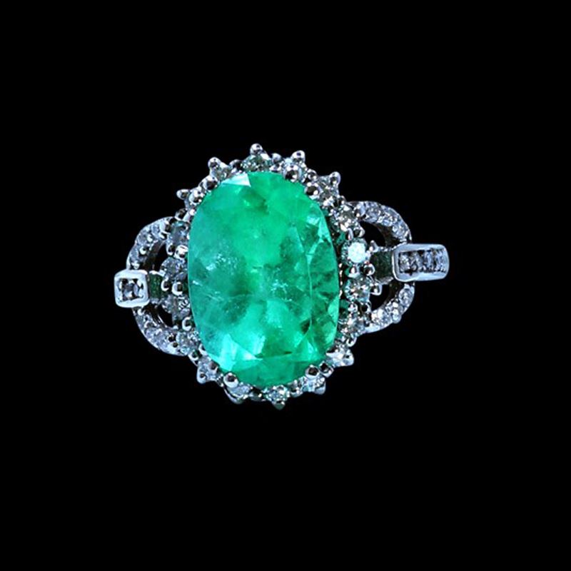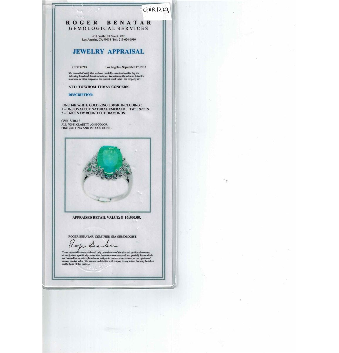 14K WHITE GOLD NATURAL COLUMBIAN EMERALD RING :3.38GRAM /EMERALD OVAL :3.92CT/DIAMOND: 0.60CT/#GVR1273