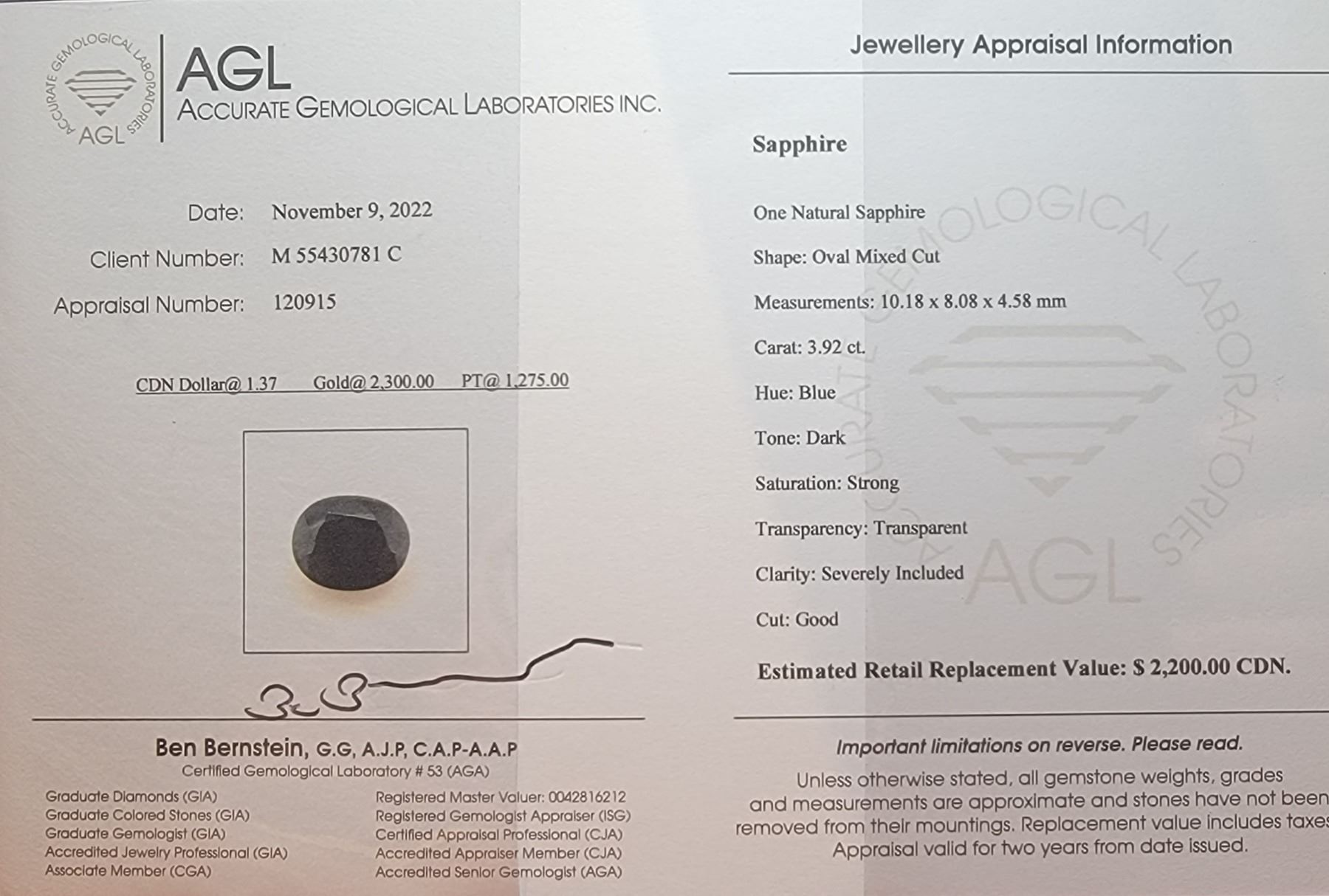 $2200 APPRAISAL, OVAL MIXED CUT - INCLUDES APPRAISAL CERTIFICATE **ALL ITEMS MUST BE REMOVED BY 5PM SATURDAY, JANUARY 21ST 2023. ALL MAGIC SPACE ITEMS MUST BE REMOVED BY WEDNESDAY, JANUARY 18TH AND ARE LOCATED AT 9058-22 AVENUE SW #102. **ALL REMAINING ITEMS WILL BE SUBJECT TO A $6.00 PER DAY STORAGE CHARGE. ANY ITEMS REMAINING AFTER MONDAY, FEBRUARY 6TH, 2023 WILL BE CONSIDERED FORFEITED. NO REFUNDS WILL BE ISSUED FOR FORFEITED ITEMS. TO SCHEDULE A PICK UP APPOINTMENT CLICK HERE