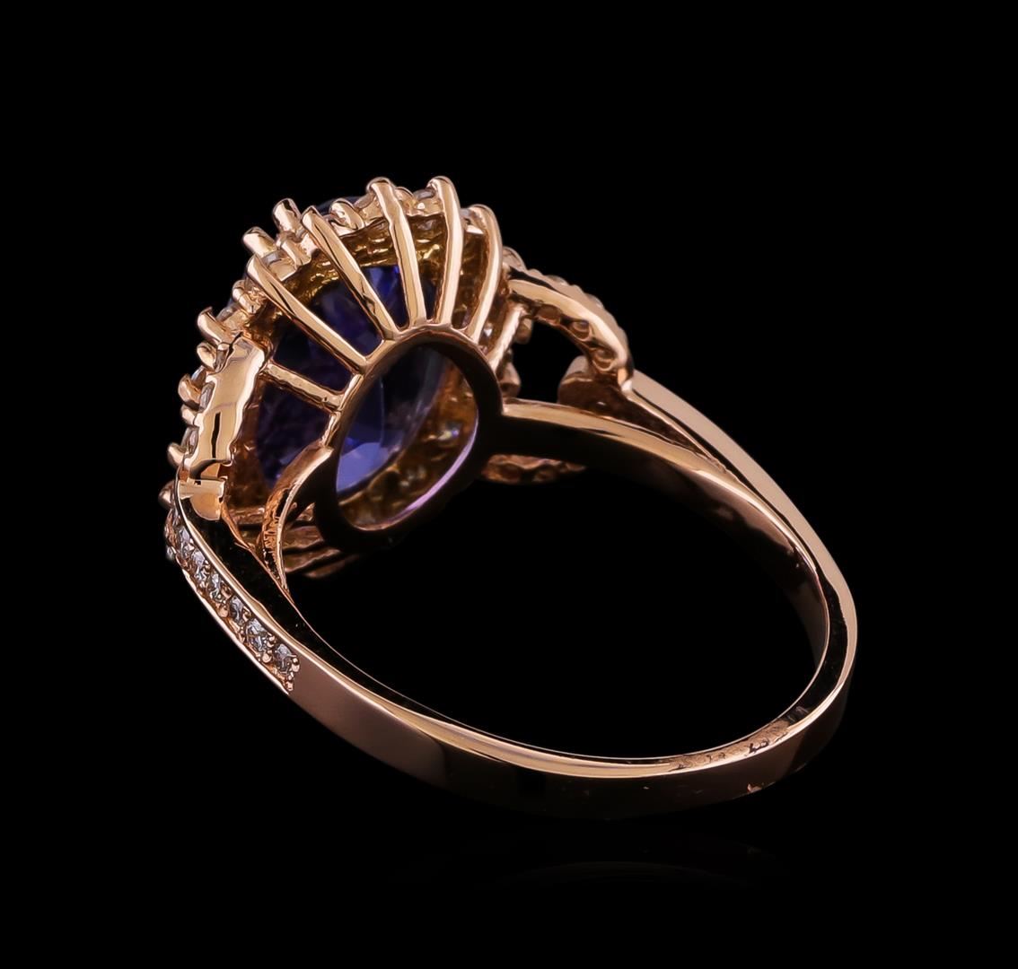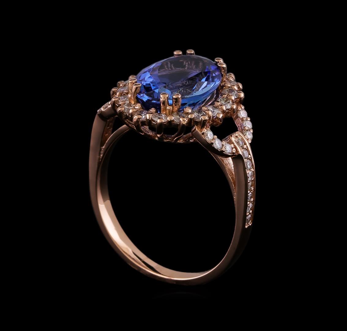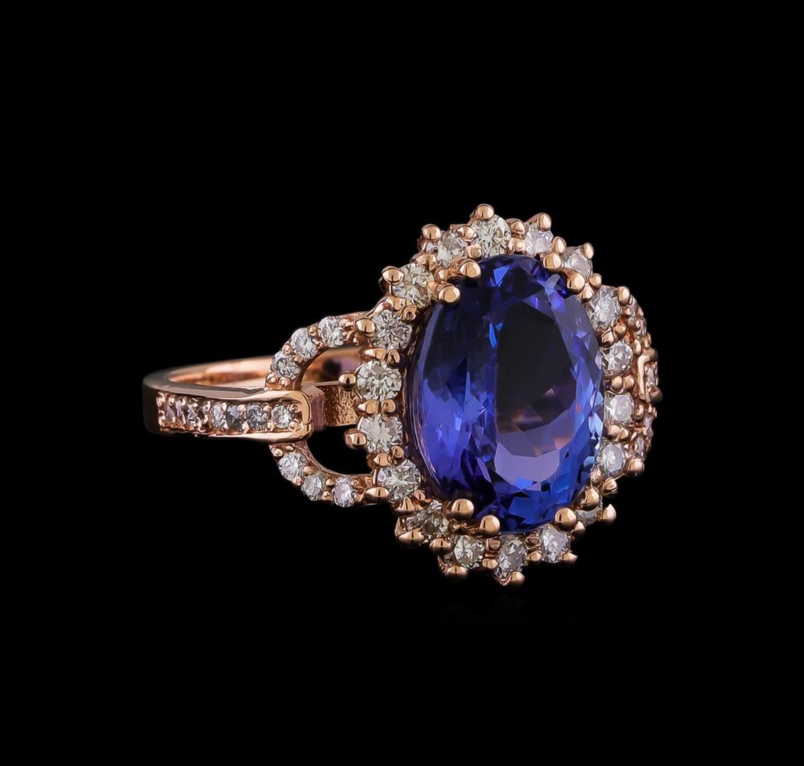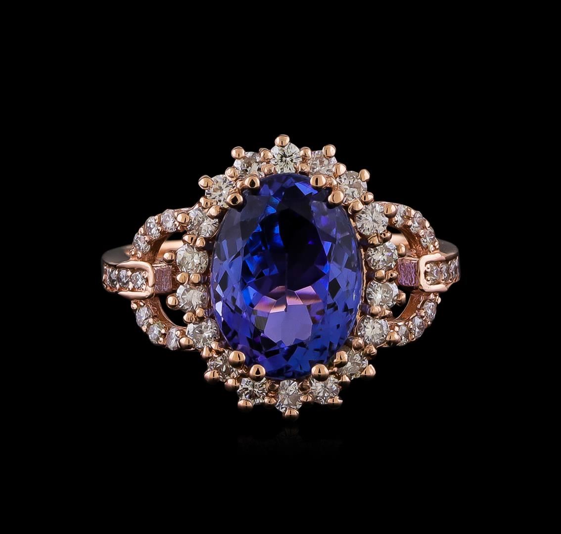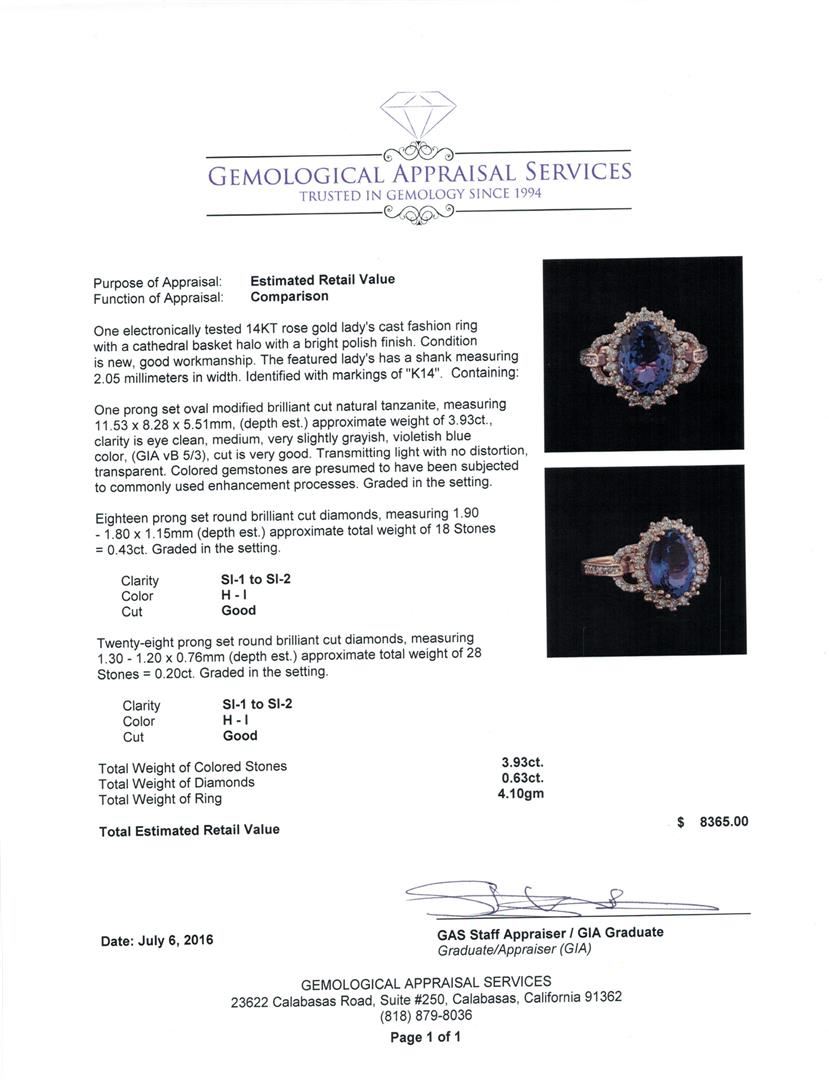 One electronically tested 14KT rose gold lady's cast fashion ring with a cathedral basket halo with a bright polish finish. The featured lady's has a shank measuring 2.05 millimeters in width. Identified with markings of "K14". Condition is new, good workmanship. Containing: One prong set oval modified brilliant cut natural tanzanite, measuring 11.53 x 8.28 x 5.51mm, (depth est.) approximate weight of 3.93ct., clarity is eye clean, medium, very slightly grayish, violetish blue color, (GIA vB 5/3), cut is very good. Transmitting light with no distortion, transparent. Colored gemstones are presumed to have been subjected to commonly used enhancement processes. Graded in the setting. Eighteen prong set round brilliant cut diamonds, measuring 1.90 - 1.80 x 1.15mm (depth est.) approximate total weight of 18 Stones = 0.43ct. Graded in the setting. Clarity: SI-1 to SI-2. Color: H - I. Cut Good Twenty-Eight prong set round brilliant cut diamonds, measuring 1.30 - 1.20 x 0.76mm (depth est.) approximate total weight of 28 Stones = 0.20ct. Graded in the setting. Clarity: SI-1 to SI-2. Color: H - I. Cut Good. Total Weight of Colored Stones 3.93ct. Total Weight of Diamonds 0.63ct. Total Weight of Ring 4.10gm.