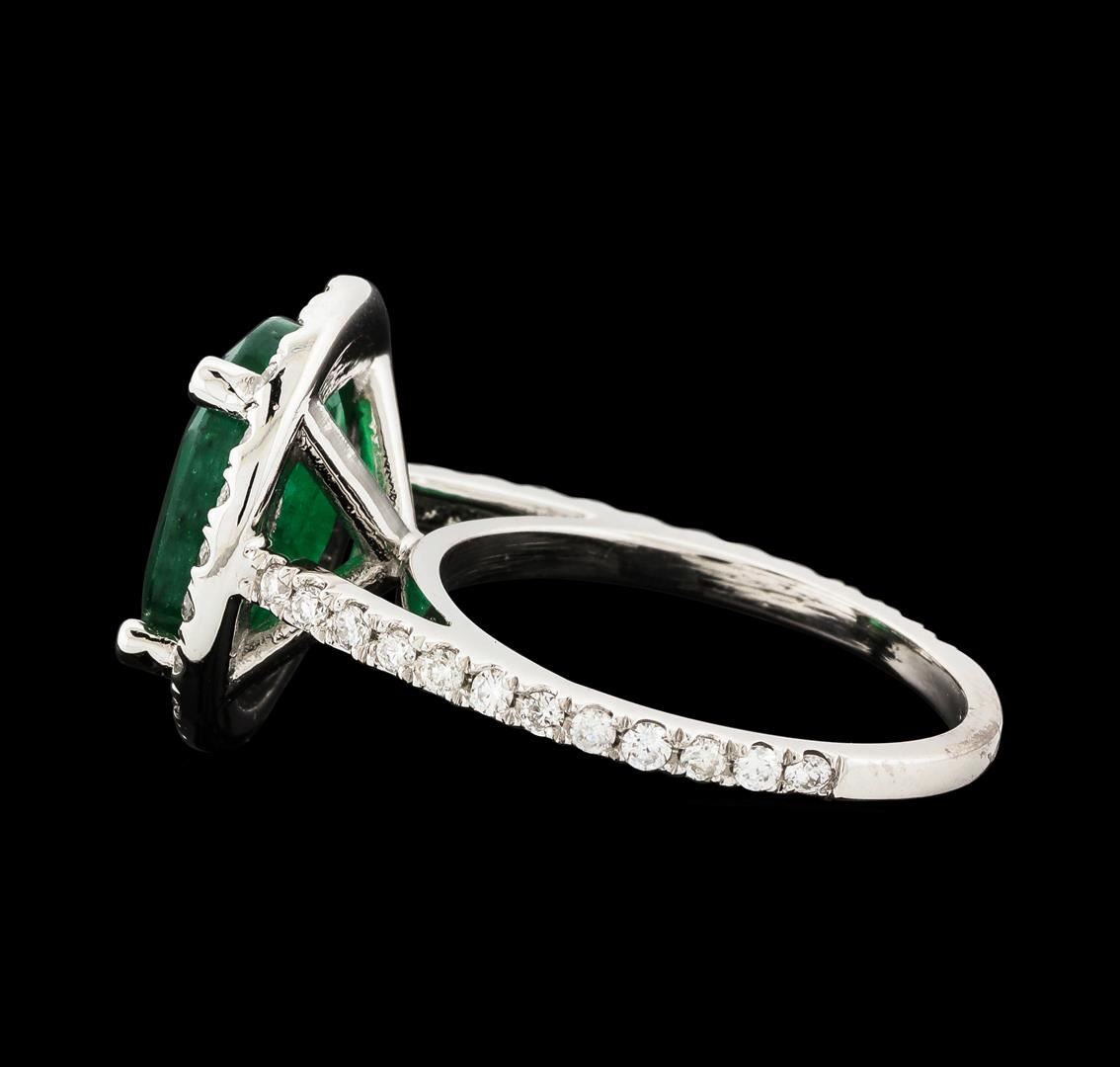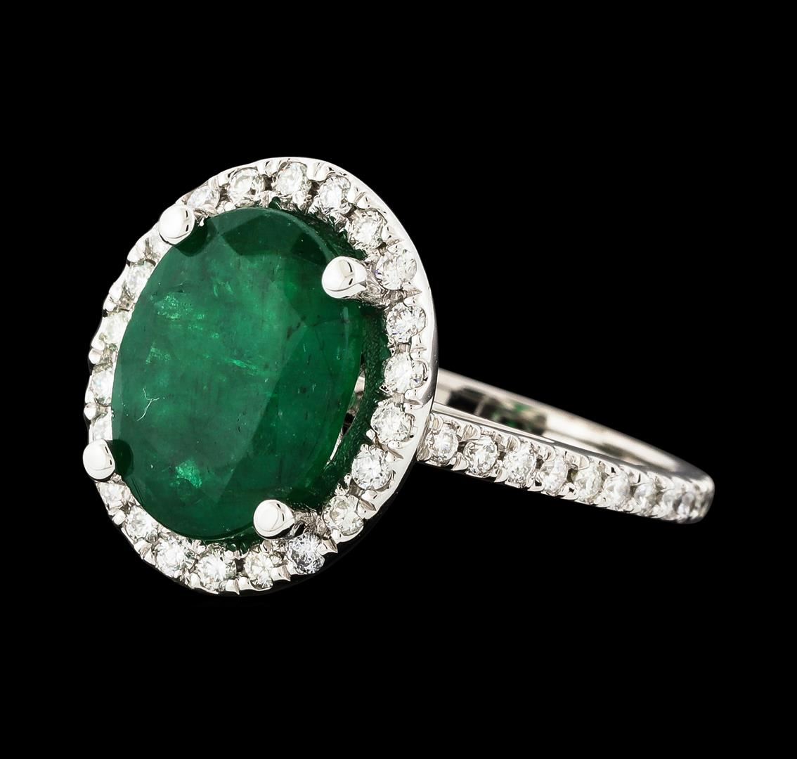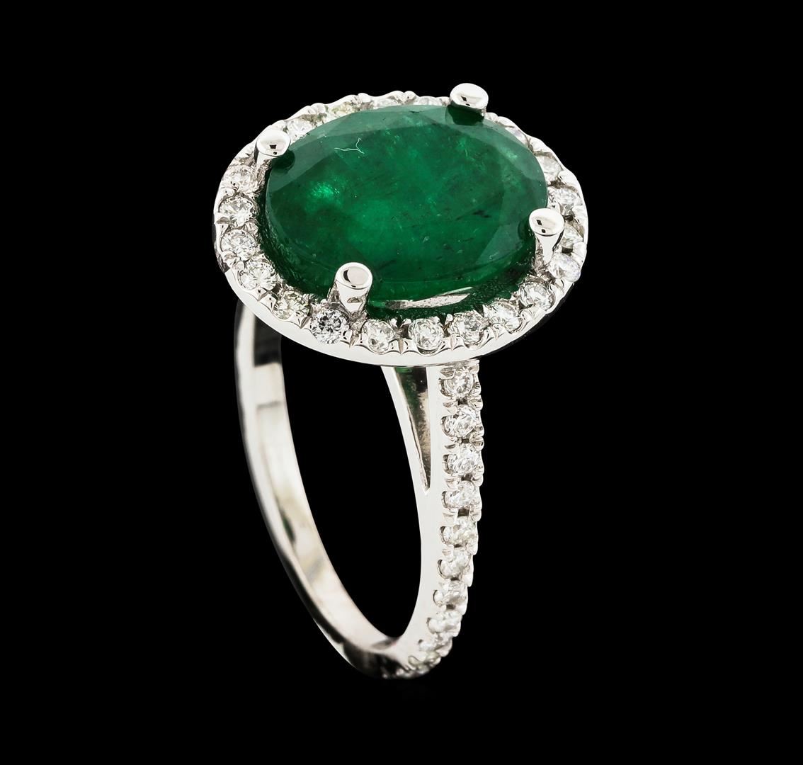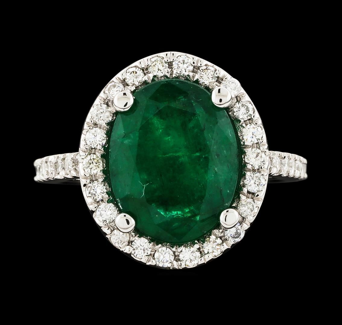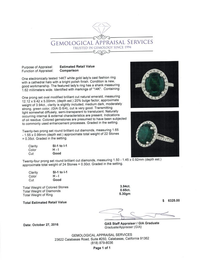 One electronically tested 14KT white gold lady's cast fashion ring with a cathedral halo with a bright polish finish. The featured lady's ring has a shank measuring 1.62 millimeters wide. Identified with markings of '14K'. Condition is new, good workmanship. Containing: One prong set oval modified brilliant cut natural emerald, measuring 12.12 x 9.42 x 5.00mm, (depth est.) 20%. bulge factor, approximate weight of 3.94ct., clarity is slightly included, medium dark, moderately strong, green color, (GIA G 6/4), cut is very good. Transmitting light somewhat diffusely, semi-transparent to translucent. Naturally occurring internal & external characteristics are present. Indications of oil residue. Colored gemstones are presumed to have been subjected to commonly used enhancement processes. Graded in the setting. Twenty-Two prong set round brilliant cut diamonds, measuring 1.65 - 1.55 x 0.99mm (depth est.) approximate total weight of 22 Stones = 0.35ct. Graded in the setting. Clarity SI-1 to I-1. Color: H - I Cut Good Twenty-Four prong set round brilliant cut diamonds, measuring 1.50 - 1.45 x 0.92mm (depth est.) approximate total weight of 24 Stones = 0.30ct. Graded in the setting. Clarity SI-1 to I-1. Color: H - I Cut Good. Total Weight of Colored Stones 3.94ct.. Total Weight of Diamonds 0.65ct.. Total Weight of Ring 5.30gm. GAS Appraised at $6,325.00.