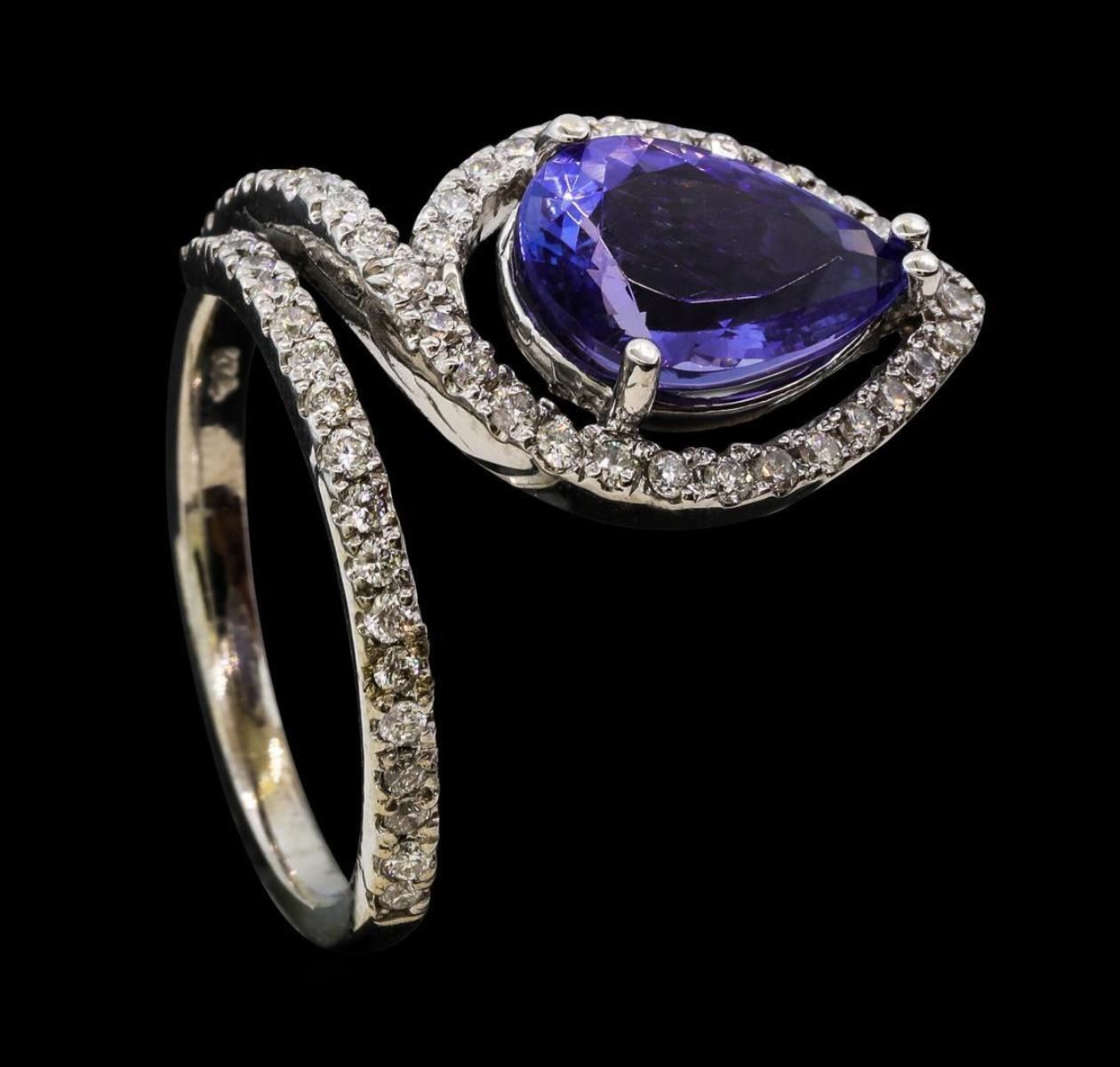 One electronically tested 14KT white gold lady's cast fashion ring with a offset halo with a bright polish finish. The featured lady's ring has a shank measuring 2.03 millimeters wide. Identified with markings of 'K14'. Condition is new, good workmanship. Containing: One prong set pear modified brilliant cut natural tanzanite, measuring 12.25 x 9.10 x 5.62mm, (depth est.) approximate weight of 3.94ct., clarity is eye clean, medium, moderately strong, bluish violet color, (GIA bV 5/4), cut is very good. Transmitting light with no distortion, transparent. Colored gemstones are presumed to have been subjected to commonly used enhancement processes. Graded in the setting. Fifty-Four prong set round brilliant cut diamonds, measuring 1.50 - 1.45 x 0.92mm (depth est.) approximate total weight of 54 Stones = 0.66ct. Graded in the setting. Clarity SI-1 to I-1. Color: G - I Cut Good. Total Weight of Colored Stones 3.94ct.. Total Weight of Diamonds 0.66ct.. Total Weight of Ring 6.40gm.