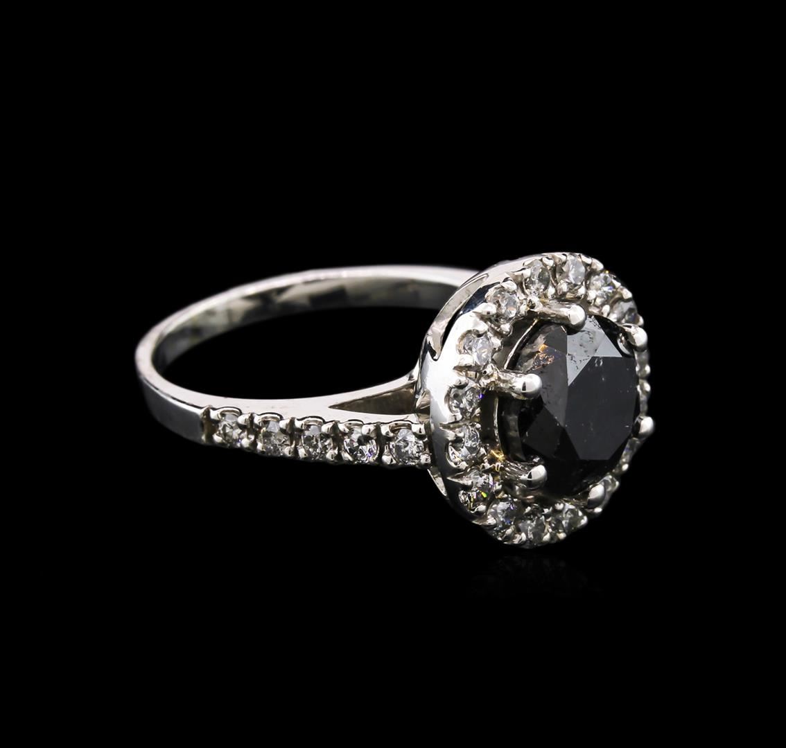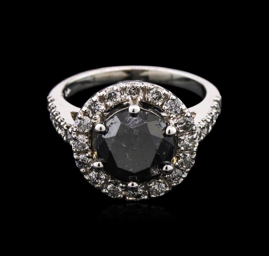 One electronically tested 14KT white gold ladies cast black and white diamond ring with a bright polish finish. Condition is new, good workmanship. The featured black diamond is set within a white diamond bezel supported by white diamond set shoulders, completed by a two millimeter wide band. Identified with markings of "K14".Containing:One prong set round brilliant cut diamond, measuring 8.75 - 8.70 x 5.50mm (depth est.), 20.00% GTCF approximate weight of 3.14ct. Indications of multiple laboratory enhancements. Graded in the setting. Clarity: Declasse. Color: Fancy Black; Irradiated. Depth: 63.0%.Table: 60.7%.Twenty-six prong set round brilliant cut diamonds, measuring 2.00 - 1.90 x 1.17mm (depth est.) approximate total weight of 26 Stones = 0.8let. Faint brown secondary color throughout. Graded in the setting. Clarity: I-2 to I-3.Color: I - K. AIG Appraised at $5,125.00.