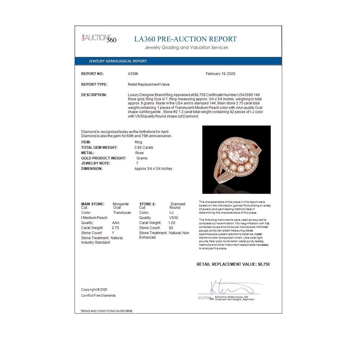 REF-176Y8X - SKU: 43599 ---- 3.95 ctw Certified Morganite & Diamond Victorian Ring 14K Rose Gold