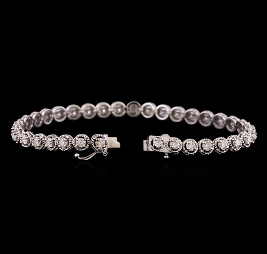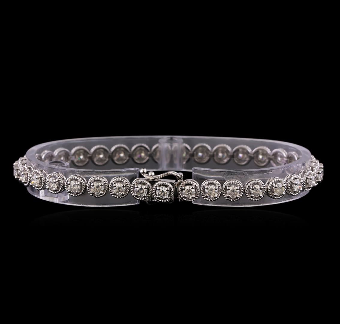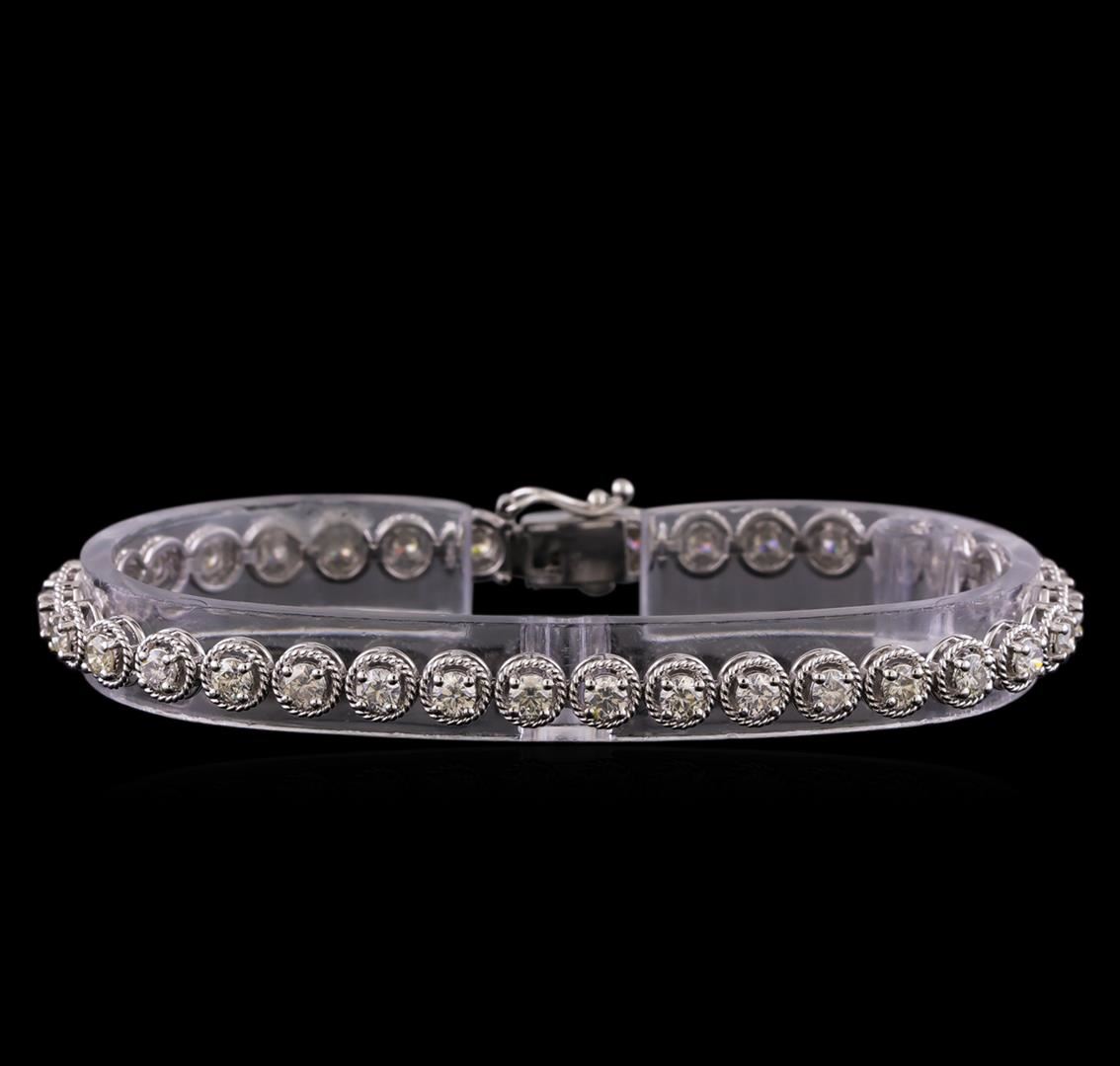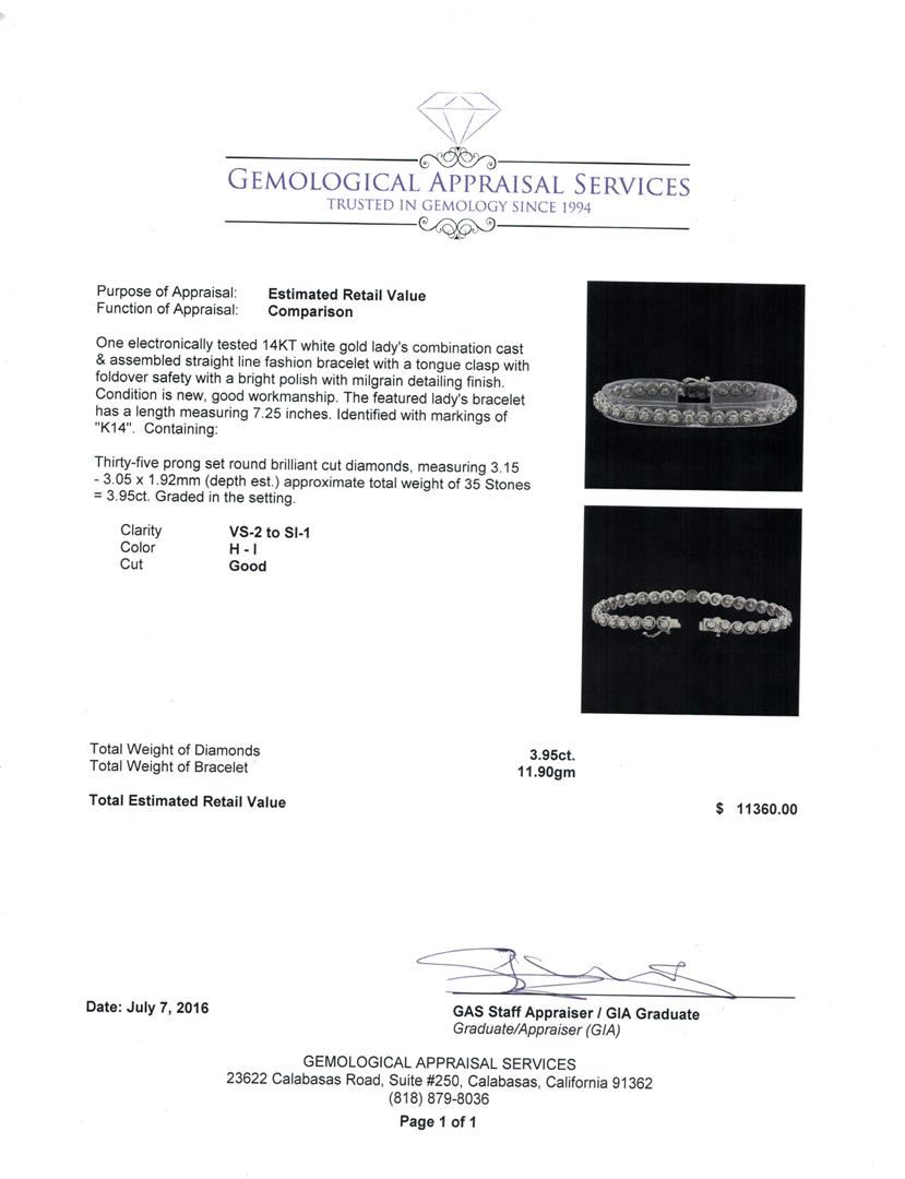One electronically tested 14KT white gold lady's combination cast & assembled straight line fashion bracelet with a tongue clasp with fold over safety with a bright polish with milgrain detailing finish. The featured lady's bracelet has a length measuring 7.25 inches. Identified with markings of "K14". Condition is new, good workmanship. Containing: Thirty-Five prong set round brilliant cut diamonds, measuring 3.15 - 3.05 x 1.92mm (depth est.) approximate total weight of 35 Stones = 3.95ct. Graded in the setting. Clarity: VS-2 to SI-1. Color: H - I. Cut Good. Total Weight of Diamonds 3.95ct. Total Weight of Bracelet 11.90gm. GAS Appraised at $11,360.00.