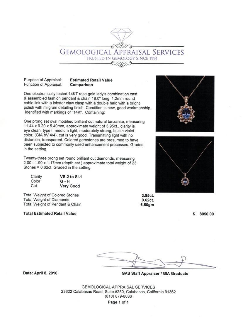 One electronically tested 14KT rose gold lady's combination cast & assembled fashion pendant & chain 18.0" long, 1.2mm round cable link with a lobster claw clasp with a double halo with a bright polish with milgrain detailing finish. Identified with markings of "14K". Condition is new, good workmanship. Containing: One prong set oval modified brilliant cut natural tanzanite, measuring 11.44 x 9.20 x 5.40mm, approximate weight of 3.95ct., clarity is eye clean, type I, medium light, moderately strong, bluish violet color, (GIA bV 4/4), cut is very good. Transmitting light with no distortion, transparent. Colored gemstones are presumed to have been subjected to commonly used enhancement processes. Graded in the setting. Twenty-Three prong set round brilliant cut diamonds, measuring 2.00 - 1.90 x 1.17mm (depth est.) approximate total weight of 23 Stones = 0.62ct. Graded in the setting. Clarity: VS-2 to SI-1. Color: G -  Very Good. Total Weight of Colored Stones 3.95ct. Total Weight of Diamonds 0.62ct. Total Weight of Pendant & Chain 6.50gm.