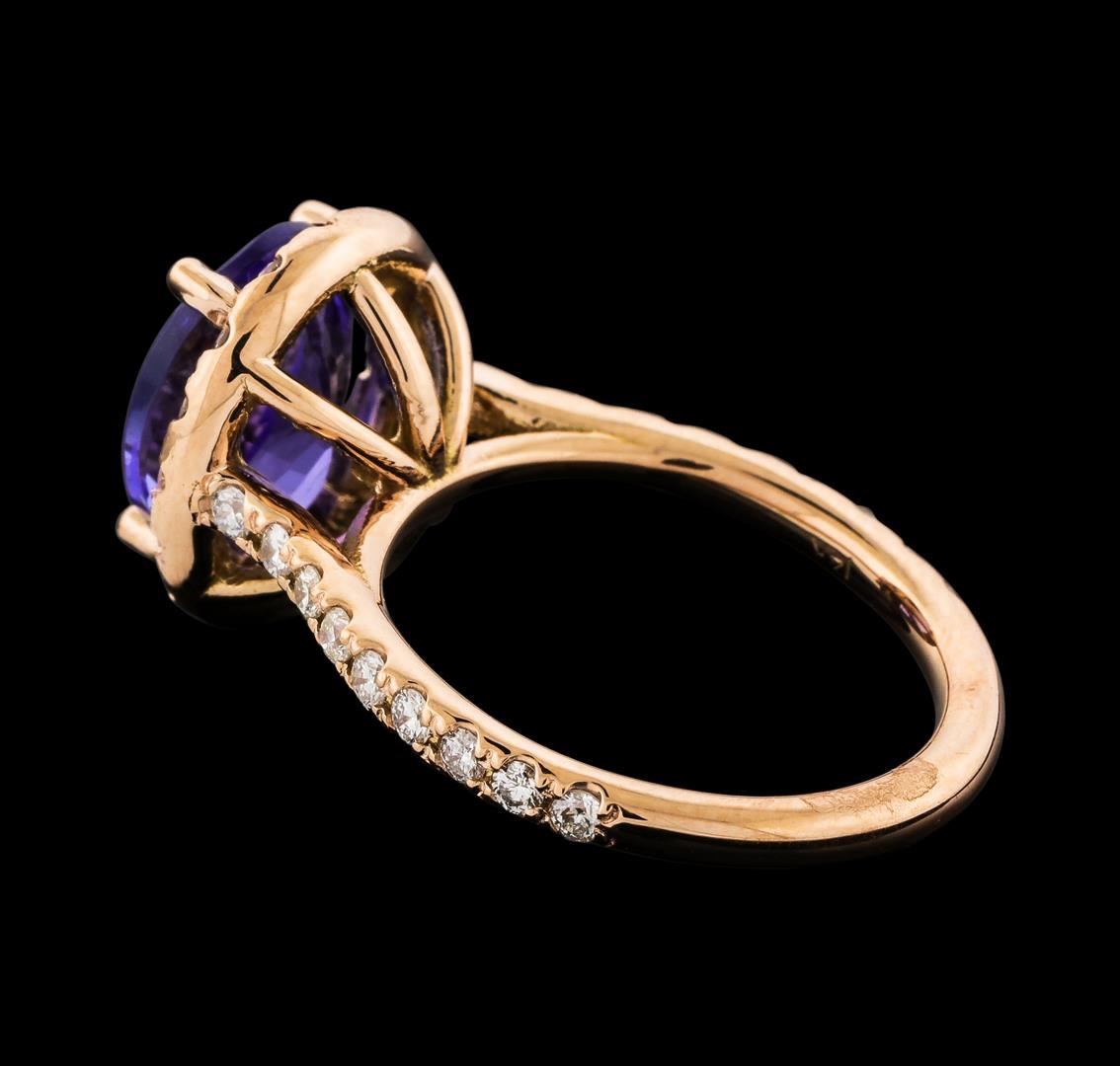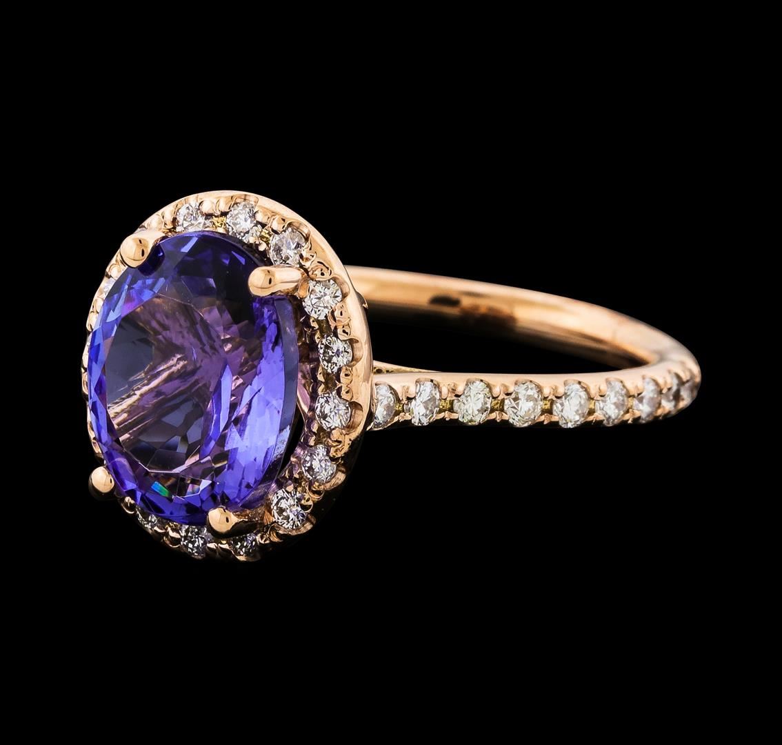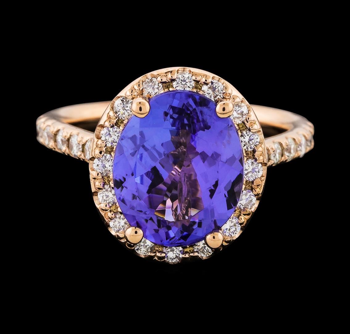 One Tanzanite and Diamond Ring featuring: 14KT Rose Gold with a total weight of 4.91 grams, One Tanzanite stone with a total weight of 3.95ct, and 34 Diamonds with a total weight of 0.53ctw.