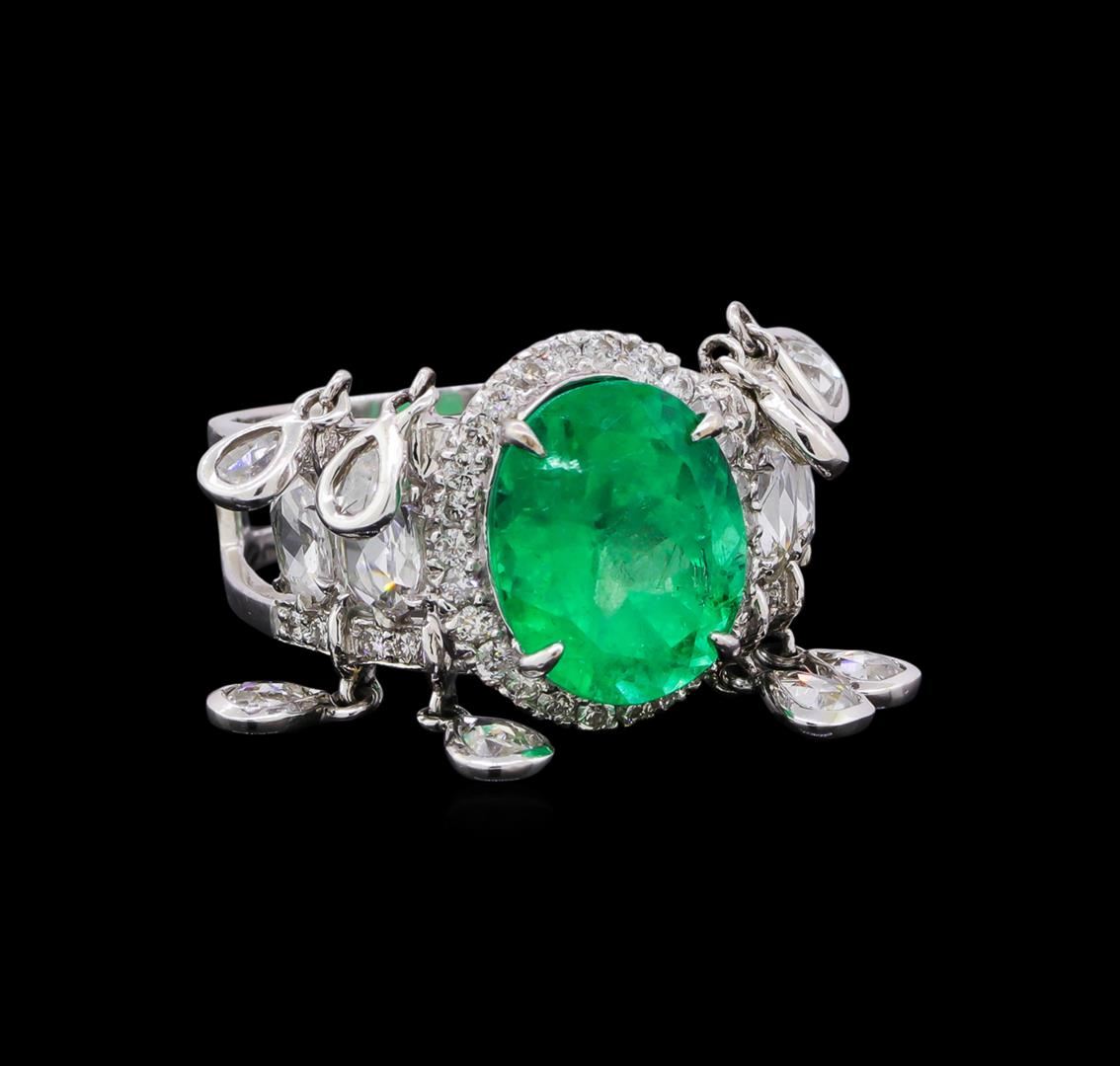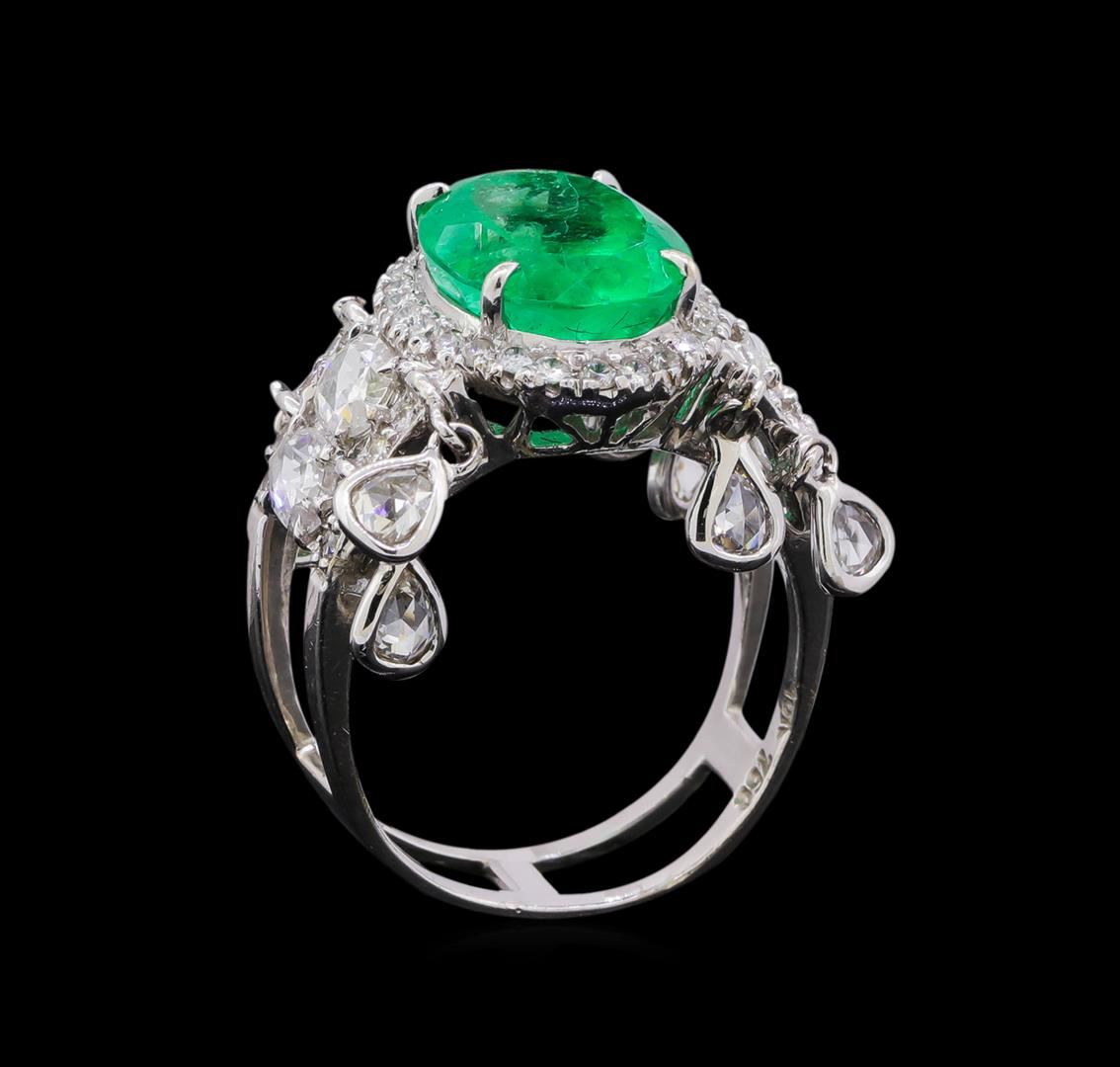 One electronically tested 18KT white gold ladies cast & assembled emerald and diamond ring with a bright polish finish. The featured emerald is set within a diamond bezel supported by mirroring diamond set open shoulders with dangling diamond tassels, completed by a five millimeter wide band. Identified with markings of "18K 750". Condition is new, good workmanship. Containing: One prong set oval mixed cut natural emerald, measuring 11.00. x 9.00. x 7.00.mm, approximate weight of 3.96ct., clarity is moderately included, type III, medium, moderately strong, very slightly bluish green color, (GIA vslbG 5/4), cut is good. Transmitting light with a minimum of distortion, transparent. Naturally occurring internal & external characteristics are present. Indications of oil residue. Graded in the setting. Four prong set rose cut diamonds, measuring 4.70 - 3.50 x 1.00.mm (depth est.) approximate total weight of 4 Stones = 0.30ct. Measurements are an average for the group. Graded in the setting. Clarity: SI-1 to I-1 . Color: F - H Eight bezel set rose cut diamonds, measuring 3.50 - 2.50 x 1.10mm (depth est.) approximate total weight of 8 Stones = 0.40ct. Measurements are an average for the group. Graded in the setting. Clarity: VS-2 to SI-2 . Color: G - I Forty-Two prong set round brilliant cut diamonds, measuring 1.40 - 1.20 x 0.78mm (depth est.) approximate total weight of 42 Stones = 0.35ct. The color grade reflects the entire range of color for this group. Graded in the setting. Clarity: SI-2 to I-2 . Color: F - I. Total Weight of Colored Stones 3.96ct.. Total Weight of Diamonds 1.05ct.. Total Weight of Ring 7.10gm. AIG Appraised at $11,430.00.
