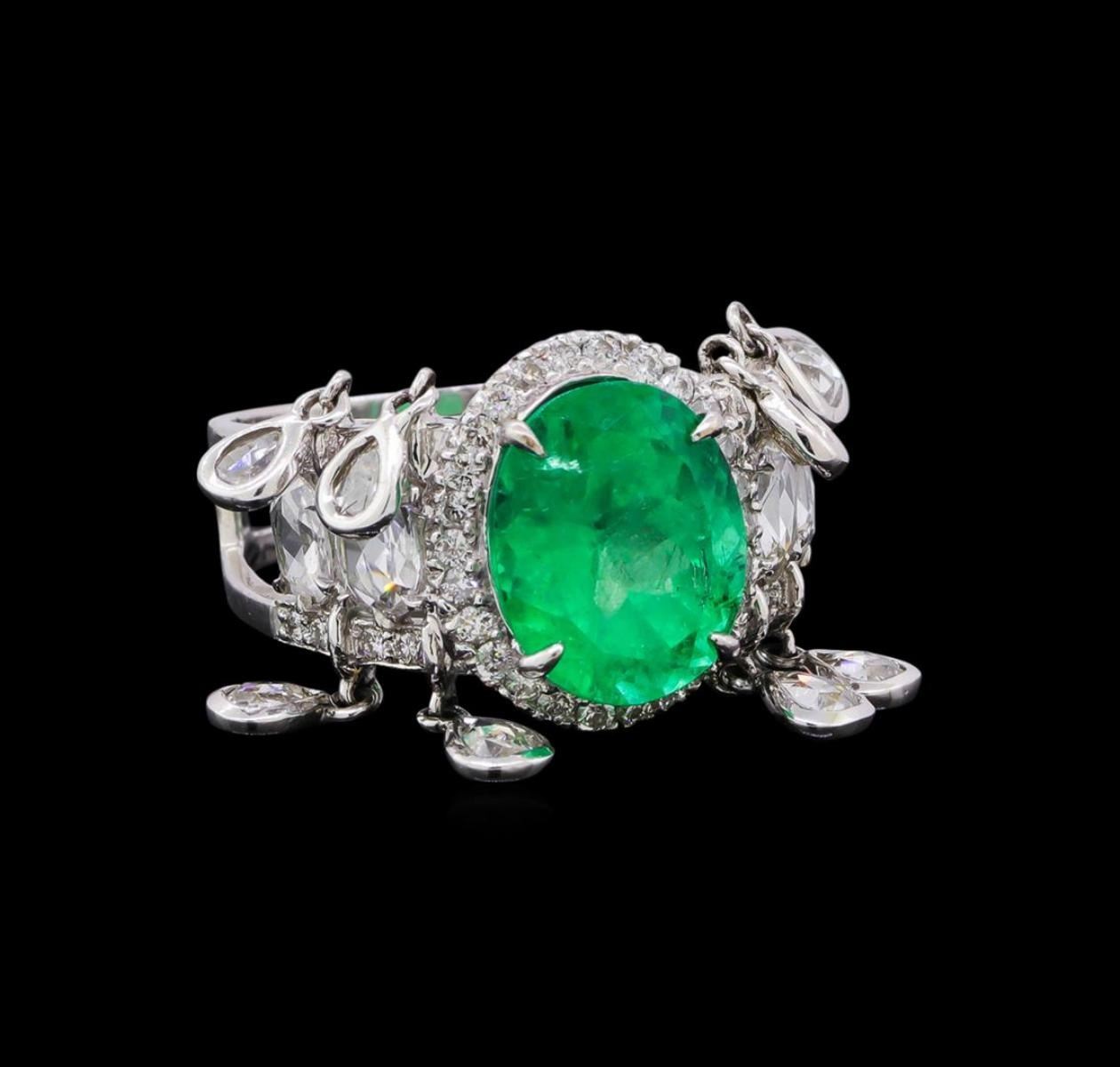One electronically tested 18KT white gold ladies cast & assembled emerald and diamond ring with a bright polish finish. The featured emerald is set within a diamond bezel supported by mirroring diamond set open shoulders with dangling diamond tassels, completed by a five millimeter wide band. Identified with markings of "18K 750". Condition is new, good workmanship. Containing: One prong set oval mixed cut natural emerald, measuring 11.00. x 9.00. x 7.00.mm, approximate weight of 3.96ct., clarity is moderately included, type III, medium, moderately strong, very slightly bluish green color, (GIA vslbG 5/4), cut is good. Transmitting light with a minimum of distortion, transparent. Naturally occurring internal & external characteristics are present. Indications of oil residue. Graded in the setting. Four prong set rose cut diamonds, measuring 4.70 - 3.50 x 1.00.mm (depth est.) approximate total weight of 4 Stones = 0.30ct. Measurements are an average for the group. Graded in the setting. Clarity: SI-1 to I-1 . Color: F - H Eight bezel set rose cut diamonds, measuring 3.50 - 2.50 x 1.10mm (depth est.) approximate total weight of 8 Stones = 0.40ct. Measurements are an average for the group. Graded in the setting. Clarity: VS-2 to SI-2 . Color: G - I Forty-Two prong set round brilliant cut diamonds, measuring 1.40 - 1.20 x 0.78mm (depth est.) approximate total weight of 42 Stones = 0.35ct. The color grade reflects the entire range of color for this group. Graded in the setting. Clarity: SI-2 to I-2 . Color: F - I. Total Weight of Colored Stones 3.96ct.. Total Weight of Diamonds 1.05ct.. Total Weight of Ring 7.10gm. AIG Appraised.