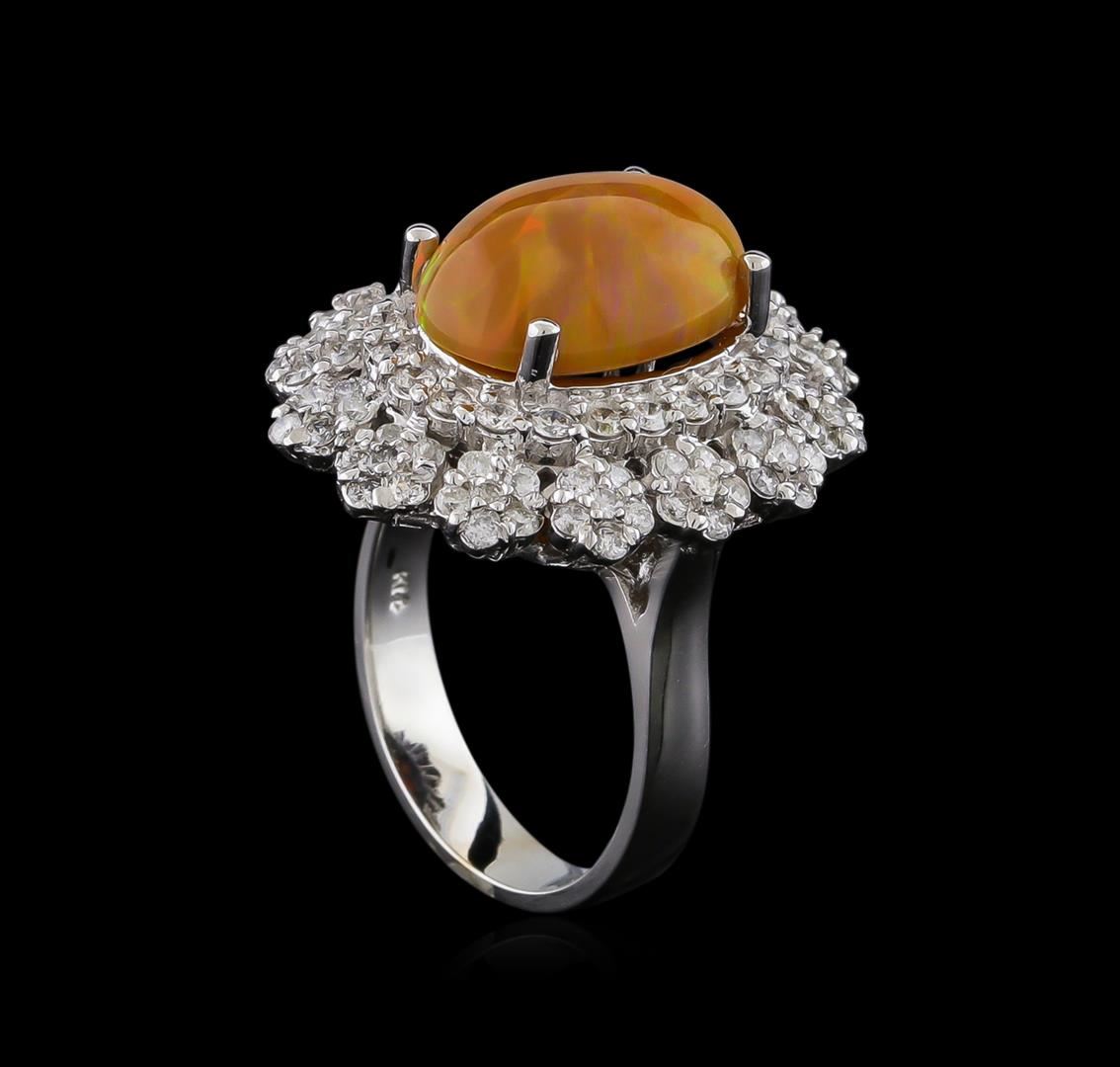 One electronically tested 14KT white gold lady's cast fashion ring with a basket double halo with a bright polish finish. The featured lady's ring has a shank measuring 3.78 millimeters wide. Identified with markings of "K14". Condition is new, good workmanship. Containing: One orange opal that is cut in a oval shaped cabochon and is prong set, measuring 14.18 mm long x 9.85 mm wide, and 5.69 mm thick and the approximate weight is 3.96 carats. The opal has a somewhat bright, orange-green play of color (fire) in a rolling flashfire pattern; a medium dome; a good cut; slightly included; slight variation in base in its brightness and pattern; and is not directional. Graded in the setting. Twenty-Two prong set round brilliant cut diamonds, measuring 1.85 - 1.75 x 1.10mm (depth est.) approximate total weight of 22 Stones = 0.48ct. Graded in the setting. Clarity: VS-2 to SI-2. Color: G - Good Eighty-Four prong set round brilliant cut diamonds, measuring 1.50 - 1.40 x 0.90mm (depth est.) approximate total weight of 84 Stones = 0.98ct. Graded in the setting. Clarity: SI-1 to I-1. Color: H - I. Cut Good. Total Weight of Diamonds 1.46ct. Total Weight of Opals 3.96ct. Total Weight of Ring 9.60gm. GAS Appraised at $6,245.00.