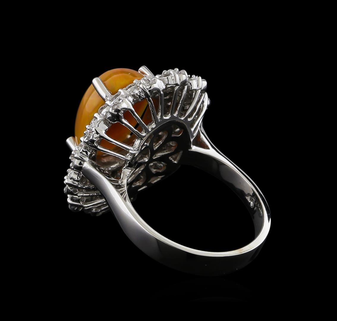 One electronically tested 14KT white gold lady's cast fashion ring with a basket double halo with a bright polish finish. The featured lady's ring has a shank measuring 3.78 millimeters wide. Identified with markings of "K14". Condition is new, good workmanship. Containing: One orange opal that is cut in a oval shaped cabochon and is prong set, measuring 14.18 mm long x 9.85 mm wide, and 5.69 mm thick and the approximate weight is 3.96 carats. The opal has a somewhat bright, orange-green play of color (fire) in a rolling flashfire pattern; a medium dome; a good cut; slightly included; slight variation in base in its brightness and pattern; and is not directional. Graded in the setting. Twenty-Two prong set round brilliant cut diamonds, measuring 1.85 - 1.75 x 1.10mm (depth est.) approximate total weight of 22 Stones = 0.48ct. Graded in the setting. Clarity: VS-2 to SI-2. Color: G - Good Eighty-Four prong set round brilliant cut diamonds, measuring 1.50 - 1.40 x 0.90mm (depth est.) approximate total weight of 84 Stones = 0.98ct. Graded in the setting. Clarity: SI-1 to I-1. Color: H - I. Cut Good. Total Weight of Diamonds 1.46ct. Total Weight of Opals 3.96ct. Total Weight of Ring 9.60gm. GAS Appraised at $6,245.00.