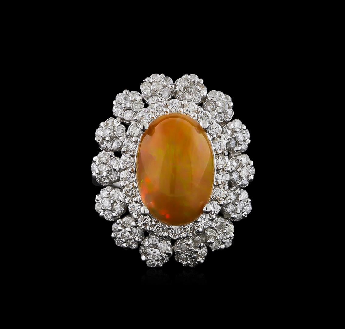 One electronically tested 14KT white gold lady's cast fashion ring with a basket double halo with a bright polish finish. The featured lady's ring has a shank measuring 3.78 millimeters wide. Identified with markings of "K14". Condition is new, good workmanship. Containing: One orange opal that is cut in a oval shaped cabochon and is prong set, measuring 14.18 mm long x 9.85 mm wide, and 5.69 mm thick and the approximate weight is 3.96 carats. The opal has a somewhat bright, orange-green play of color (fire) in a rolling flashfire pattern; a medium dome; a good cut; slightly included; slight variation in base in its brightness and pattern; and is not directional. Graded in the setting. Twenty-Two prong set round brilliant cut diamonds, measuring 1.85 - 1.75 x 1.10mm (depth est.) approximate total weight of 22 Stones = 0.48ct. Graded in the setting. Clarity: VS-2 to SI-2. Color: G - Good Eighty-Four prong set round brilliant cut diamonds, measuring 1.50 - 1.40 x 0.90mm (depth est.) approximate total weight of 84 Stones = 0.98ct. Graded in the setting. Clarity: SI-1 to I-1. Color: H - I. Cut Good. Total Weight of Diamonds 1.46ct. Total Weight of Opals 3.96ct. Total Weight of Ring 9.60gm. GAS Appraised at $6,245.00.
