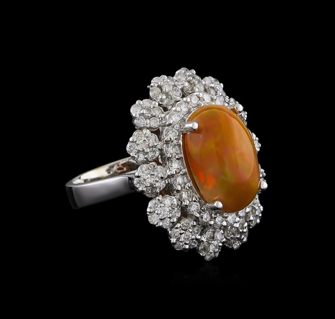 One electronically tested 14KT white gold lady's cast fashion ring with a basket double halo with a bright polish finish. The featured lady's ring has a shank measuring 3.78 millimeters wide. Identified with markings of "K14". Condition is new, good workmanship. Containing: One orange opal that is cut in a oval shaped cabochon and is prong set, measuring 14.18 mm long x 9.85 mm wide, and 5.69 mm thick and the approximate weight is 3.96 carats. The opal has a somewhat bright, orange-green play of color (fire) in a rolling flashfire pattern; a medium dome; a good cut; slightly included; slight variation in base in its brightness and pattern; and is not directional. Graded in the setting. Twenty-Two prong set round brilliant cut diamonds, measuring 1.85 - 1.75 x 1.10mm (depth est.) approximate total weight of 22 Stones = 0.48ct. Graded in the setting. Clarity: VS-2 to SI-2. Color: G - Good Eighty-Four prong set round brilliant cut diamonds, measuring 1.50 - 1.40 x 0.90mm (depth est.) approximate total weight of 84 Stones = 0.98ct. Graded in the setting. Clarity: SI-1 to I-1. Color: H - I. Cut Good. Total Weight of Diamonds 1.46ct. Total Weight of Opals 3.96ct. Total Weight of Ring 9.60gm. GAS Appraised at $6,245.00.