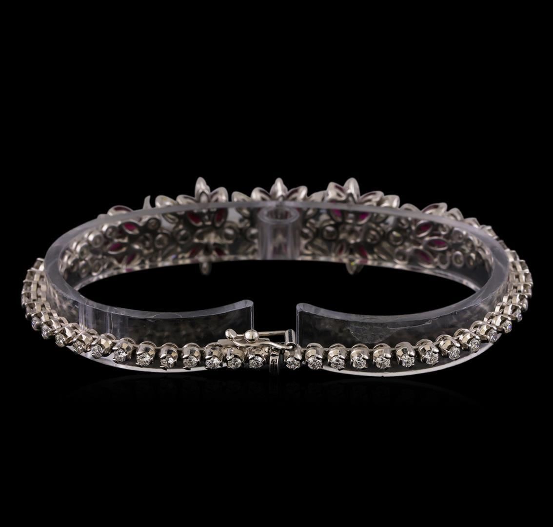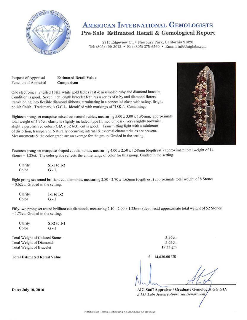One electronically tested 18KT white gold ladies cast & assembled ruby and diamond bracelet. Seven inch length bracelet features a series of ruby and diamond florets transitioning into flexible diamond ribbons, terminating in a concealed clasp with safety. Bright polish finish. Trademark is G.C.I. Identified with markings of '18Kt'. Condition is good. Containing: Eighteen prong set marquise mixed cut natural rubies, measuring 5.00 x 3.00 x 1.95mm, approximate total weight of 3.96ct., clarity is slightly included, type II, medium dark, very slightly brownish, slightly purplish red color, (GIA slpR 6/3), cut is good. Transmitting light with a minimum of distortion, transparent. Naturally occurring internal & external characteristics are present. Measurements & the color grade are an average for the group. Graded in the setting. Fourteen prong set marquise shaped cut diamonds, measuring 4.00 x 2.50 x 1.58mm (depth est.) approximate total weight of 14 Stones = 1.28ct. The color grade reflects the entire range of color for this group. Graded in the setting. Clarity SI-1 to I-2. Color: G - L Eight prong set round brilliant cut diamonds, measuring 2.80 - 2.70 x 1.65mm (depth est.) approximate total weight of 8 Stones = 0.62ct. Graded in the setting. Clarity I-1 to I-2. Color: G - I Fifty-Two prong set round brilliant cut diamonds, measuring 2.10 - 2.00 x 1.23mm (depth est.) approximate total weight of 52 Stones = 1.73ct. Graded in the setting. Clarity SI-2 to I-1. Color: G - I. Total Weight of Colored Stones 3.96ct.. Total Weight of Diamonds 3.63ct.. Total Weight of Bracelet 19.32gm. AIG Appraised.