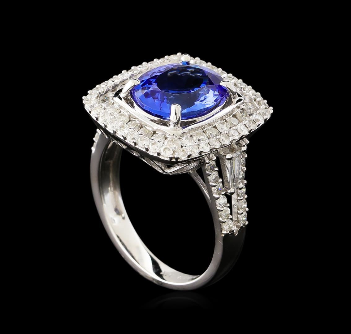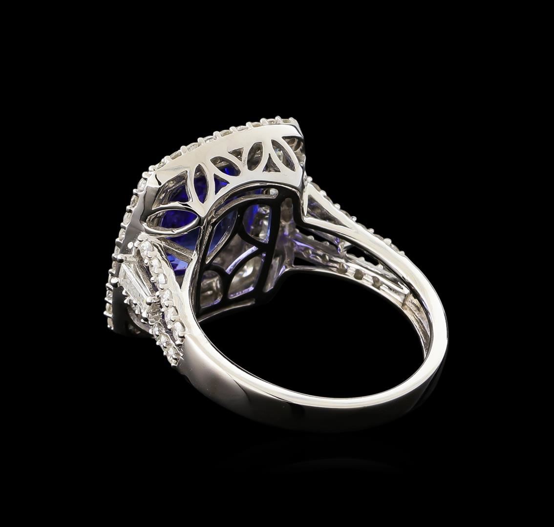 One electronically tested 14KT white gold ladies cast tanzanite and diamond ring with a bright polish finish. The featured tanzanite is set within tiered diamond bezels supported by diamond set split shoulders, completed by a two and one-half millimeter wide band. Trademark is Orianne. Identified with markings of "14K". Condition is new, good workmanship. Containing: One prong set oval mixed cut natural tanzanite, measuring 10.90 x 8.85 x 5.50mm, 6%. bulge factor, approximate weight of 3.96ct., clarity is eye clean, type I, medium dark, very slightly grayish, bluish violet color, (GIA bV 6/3), cut is good. Transmitting light with no distortion, transparent. Graded in the setting. Tanzanite is a very rare gemstone that is only found in the country of Tanzania. Originally discovered in 1967. Tiffany & Company, named the stone Tanzanite. It is found in the Usumburu Mountains that border the Umba Valley of northern Tanzania. Tanzanite occurs in gray, brown, violet, blue, reddish-purple, & green. The gem is interesting because of its exceptional pleochroism. Rotated in different directions a tanzanite will exhibit multiple changes of color. Tanzanite has a low tolerance to ultrasonic cleaning, and should not be cleaned using this method. Eighty-Eight prong & channel set round brilliant cut diamonds, measuring 1.70 - 1.30 x 0.90mm (depth est.) approximate total weight of 88 Stones = 1.21ct. Graded in the setting. Clarity: I-2 to I-3. Color: G - I Two prong set baguette cut (tapered) diamonds, measuring from 3.80 x 1.60 x 1.12mm (depth est.) to 4.20 x 1.80 x 1.26mm (depth est.) approximate total weight of 2 Stones = 0.15ct. Graded in the setting. Clarity: SI-2 to I-1. Color: H. Total Weight of Colored Stones 3.96ct. Total Weight of Diamonds 1.36ct. Total Weight of Ring 6.44gm. AIG Appraised at $12,350.00.