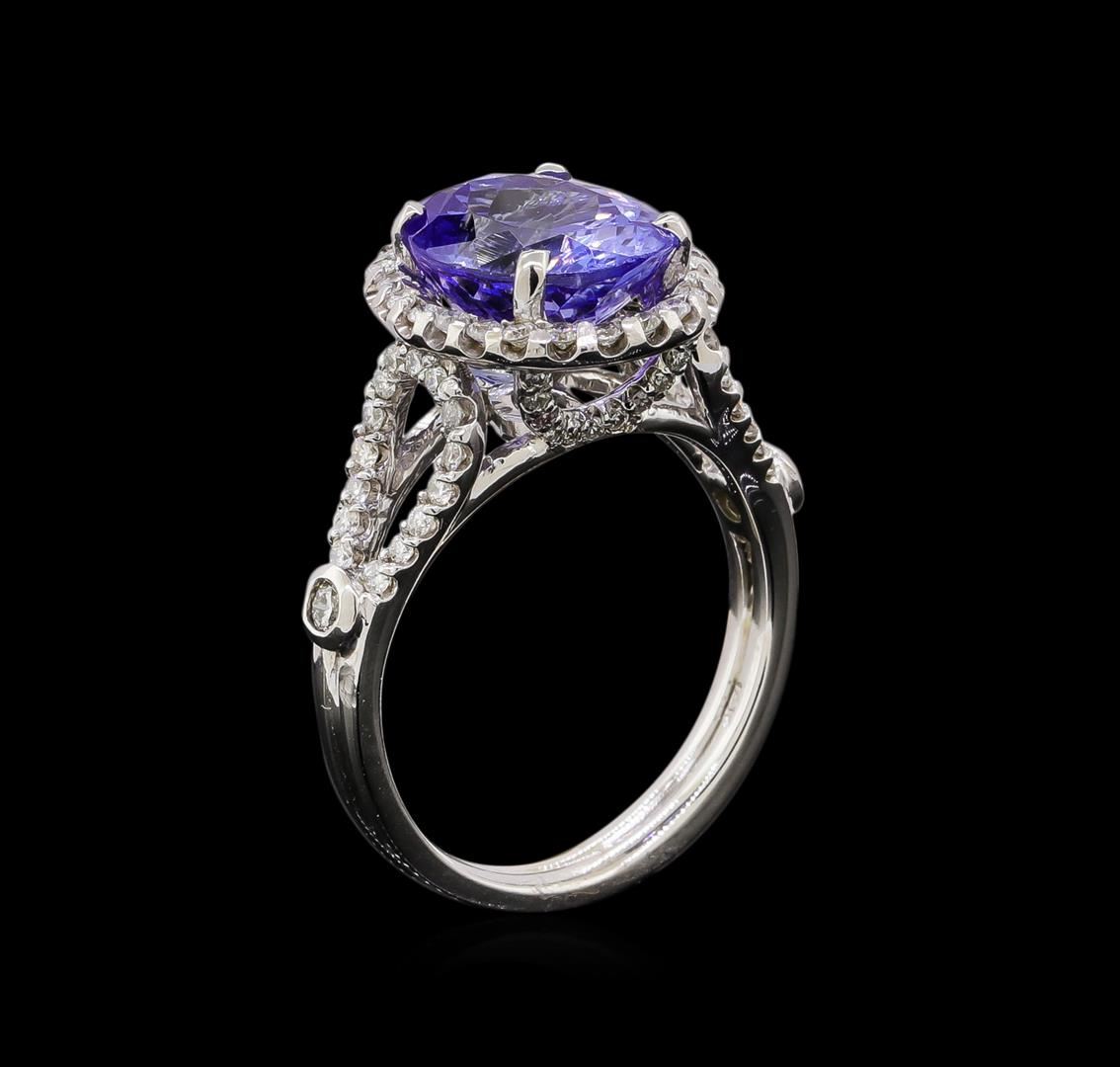 One electronically tested 14KT white gold lady's cast fashion ring with a halo with a bright polish finish. The featured lady's ring has a shank measuring 3.42 millimeters wide. Identified with markings of '14K'. Condition is new, good workmanship. Containing: One prong set oval modified brilliant cut natural tanzanite, measuring 10.65 x 8.30 x 5.95mm, (depth est.) 5%. bulge factor, approximate weight of 3.96ct., clarity is eye clean, medium, moderately strong, violetish blue color, (GIA vB 5/4), cut is very good. Transmitting light with no distortion, transparent. Colored gemstones are presumed to have been subjected to commonly used enhancement processes. Graded in the setting. Forty-Two prong set round brilliant cut diamonds, measuring 1.45 - 1.35 x 0.87mm (depth est.) approximate total weight of 42 Stones = 0.45ct. Graded in the setting. Clarity SI-1 to SI-2. Color: H - I Cut Good Forty-Eight prong set round brilliant cut diamonds, measuring 1.30 - 1.20 x 0.78mm (depth est.) approximate total weight of 48 Stones = 0.37ct. Graded in the setting. Clarity SI-1 to SI-2. Color: H - I Cut Good. Total Weight of Colored Stones 3.96ct.. Total Weight of Diamonds 0.82ct.. Total Weight of Ring 6.60gm. GAS Appraised at $9,840.00.
