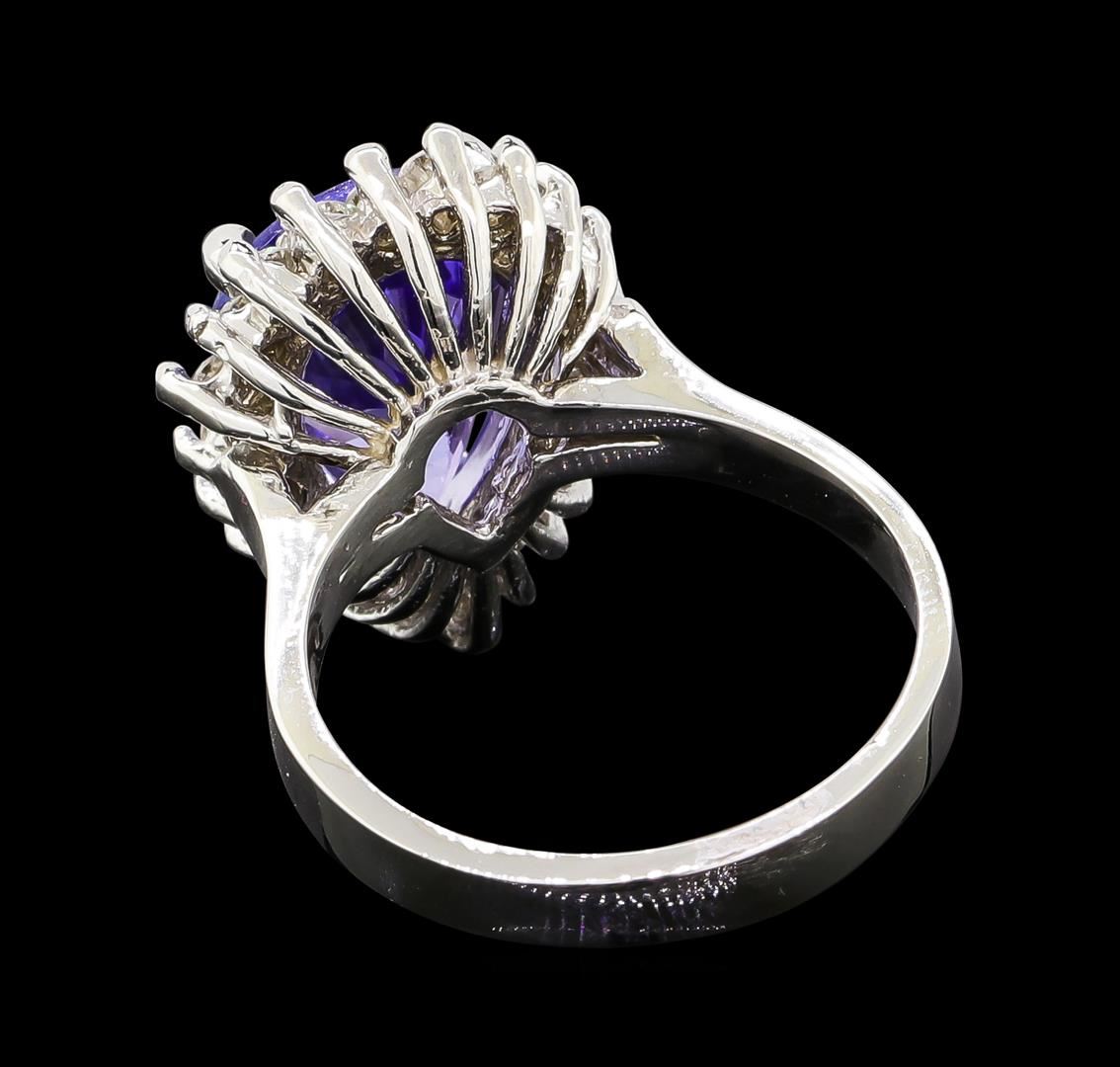 One electronically tested 14KT white gold lady's cast fashion ring with a basket halo with a bright polish finish. The featured lady's ring has a shank measuring 2.94 millimeters wide. Identified with markings of '14K'. Condition is new, good workmanship. Containing: One prong set pear modified brilliant cut natural tanzanite, measuring 11.90 x 9.50 x 5.92mm, (depth est.) approximate weight of 3.96ct., clarity is eye clean, medium, moderately strong, bluish violet color, (GIA bV 5/4), cut is very good. Transmitting light with no distortion, transparent. Colored gemstones are presumed to have been subjected to commonly used enhancement processes. Graded in the setting. Twenty-Two prong set round brilliant cut diamonds, measuring 1.90 - 1.85 x 1.17mm (depth est.) approximate total weight of 22 Stones = 0.55ct. Graded in the setting. Clarity SI-1 to I-1. Color: H - I Cut Good. Total Weight of Colored Stones 3.96ct.. Total Weight of Diamonds 0.55ct.. Total Weight of Ring 6.20gm. GAS Appraised at $8,330.00.