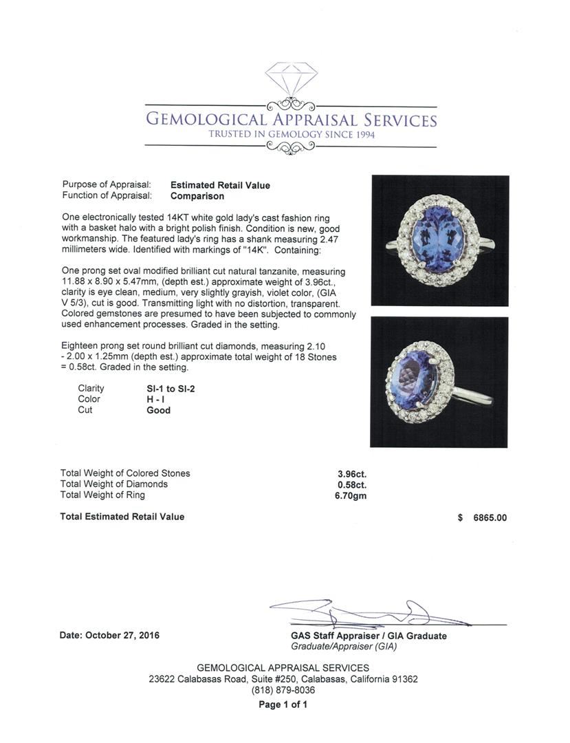 One electronically tested 14KT white gold lady's cast fashion ring with a basket halo with a bright polish finish. The featured lady's ring has a shank measuring 2.47 millimeters wide. Identified with markings of '14K'. Condition is new, good workmanship. Containing: One prong set oval modified brilliant cut natural tanzanite, measuring 11.88 x 8.90 x 5.47mm, (depth est.) approximate weight of 3.96ct., clarity is eye clean, medium, very slightly grayish, violet color, (GIA V 5/3), cut is good. Transmitting light with no distortion, transparent. Colored gemstones are presumed to have been subjected to commonly used enhancement processes. Graded in the setting. Eighteen prong set round brilliant cut diamonds, measuring 2.10 - 2.00 x 1.25mm (depth est.) approximate total weight of 18 Stones = 0.58ct. Graded in the setting. Clarity SI-1 to SI-2. Color: H - I Cut Good. Total Weight of Colored Stones 3.96ct.. Total Weight of Diamonds 0.58ct.. Total Weight of Ring 6.70gm. GAS Appraised at $6,865.00.