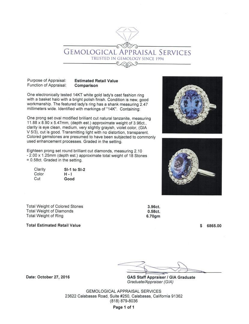 One electronically tested 14KT white gold lady's cast fashion ring with a basket halo with a bright polish finish. The featured lady's ring has a shank measuring 2.47 millimeters wide. Identified with markings of '14K'. Condition is new, good workmanship. Containing: One prong set oval modified brilliant cut natural tanzanite, measuring 11.88 x 8.90 x 5.47mm, (depth est.) approximate weight of 3.96ct., clarity is eye clean, medium, very slightly grayish, violet color, (GIA V 5/3), cut is good. Transmitting light with no distortion, transparent. Colored gemstones are presumed to have been subjected to commonly used enhancement processes. Graded in the setting. Eighteen prong set round brilliant cut diamonds, measuring 2.10 - 2.00 x 1.25mm (depth est.) approximate total weight of 18 Stones = 0.58ct. Graded in the setting. Clarity SI-1 to SI-2. Color: H - I Cut Good. Total Weight of Colored Stones 3.96ct.. Total Weight of Diamonds 0.58ct.. Total Weight of Ring 6.70gm.