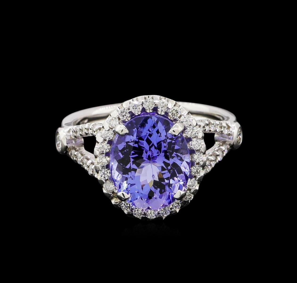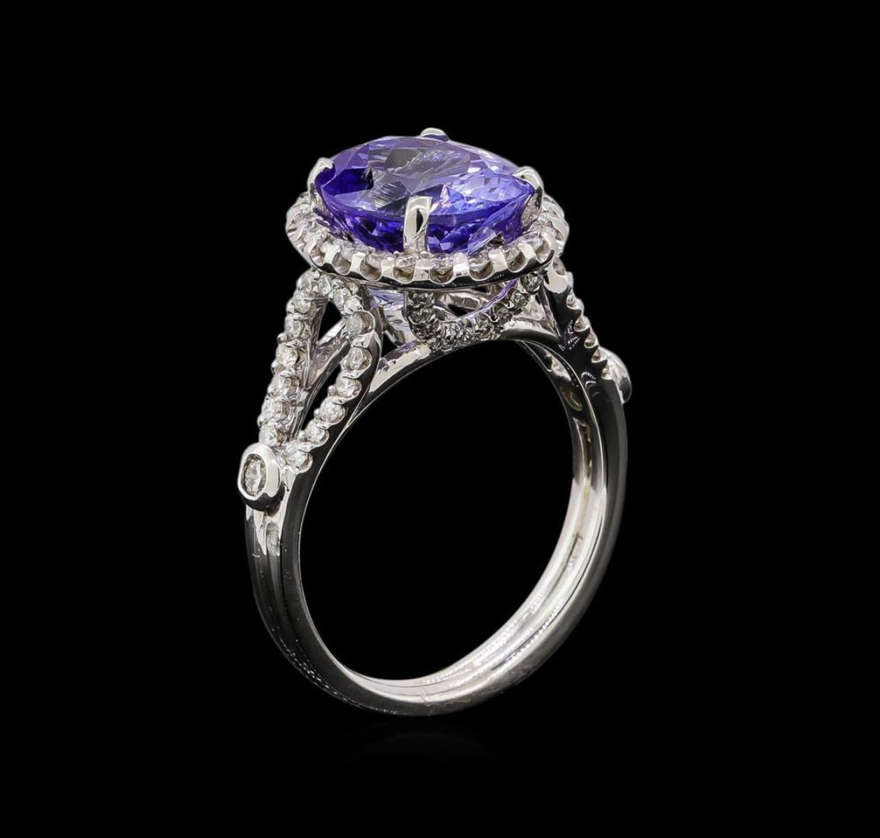 One electronically tested 14KT white gold lady's cast fashion ring with a halo with a bright polish finish. The featured lady's ring has a shank measuring 3.42 millimeters wide. Identified with markings of '14K'. Condition is new, good workmanship. Containing: One prong set oval modified brilliant cut natural tanzanite, measuring 10.65 x 8.30 x 5.95mm, (depth est.) 5%. bulge factor, approximate weight of 3.96ct., clarity is eye clean, medium, moderately strong, violetish blue color, (GIA vB 5/4), cut is very good. Transmitting light with no distortion, transparent. Colored gemstones are presumed to have been subjected to commonly used enhancement processes. Graded in the setting. Forty-Two prong set round brilliant cut diamonds, measuring 1.45 - 1.35 x 0.87mm (depth est.) approximate total weight of 42 Stones = 0.45ct. Graded in the setting. Clarity SI-1 to SI-2. Color: H - I Cut Good Forty-Eight prong set round brilliant cut diamonds, measuring 1.30 - 1.20 x 0.78mm (depth est.) approximate total weight of 48 Stones = 0.37ct. Graded in the setting. Clarity SI-1 to SI-2. Color: H - I Cut Good. Total Weight of Colored Stones 3.96ct.. Total Weight of Diamonds 0.82ct.. Total Weight of Ring 6.60gm.